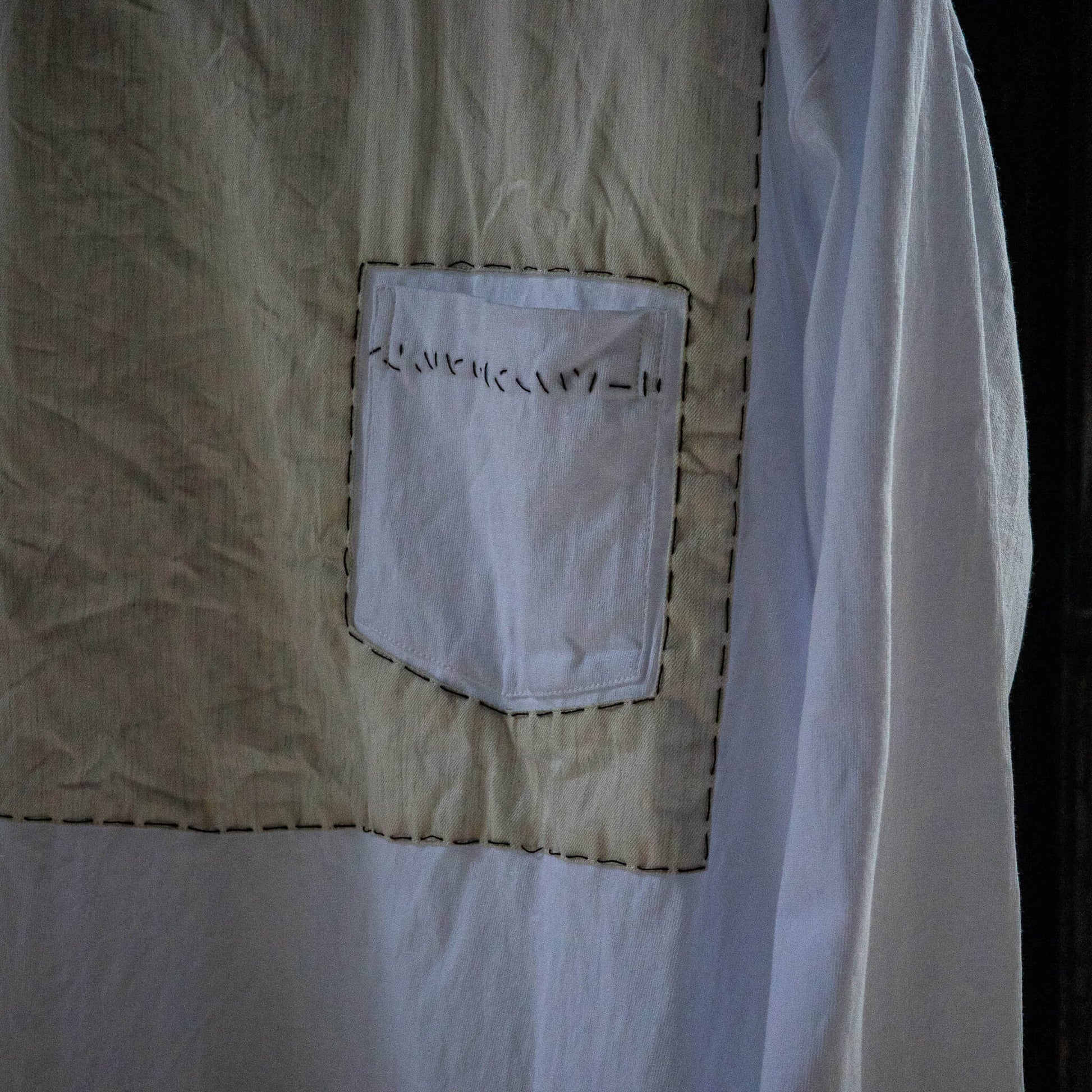 異なる素材をハンドステッチで縫い付けたデザイン性の高い1着。