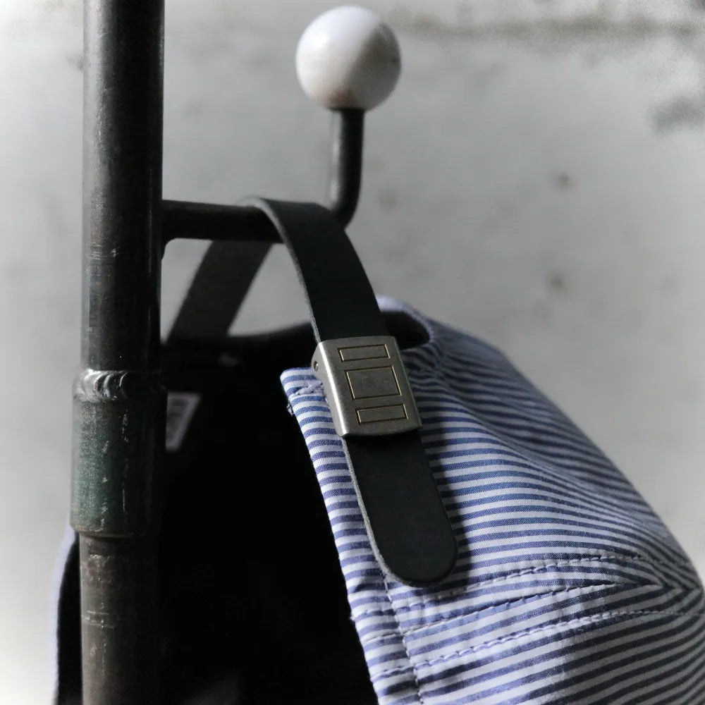 背面のレザーベルトによりサイズ調節も可能。バックルパーツにはブランドのロゴマークが刻印されています。