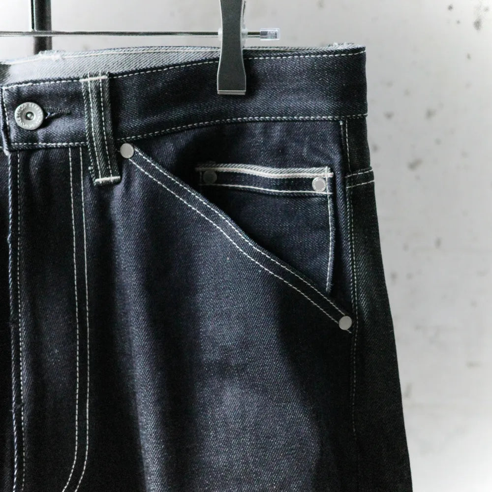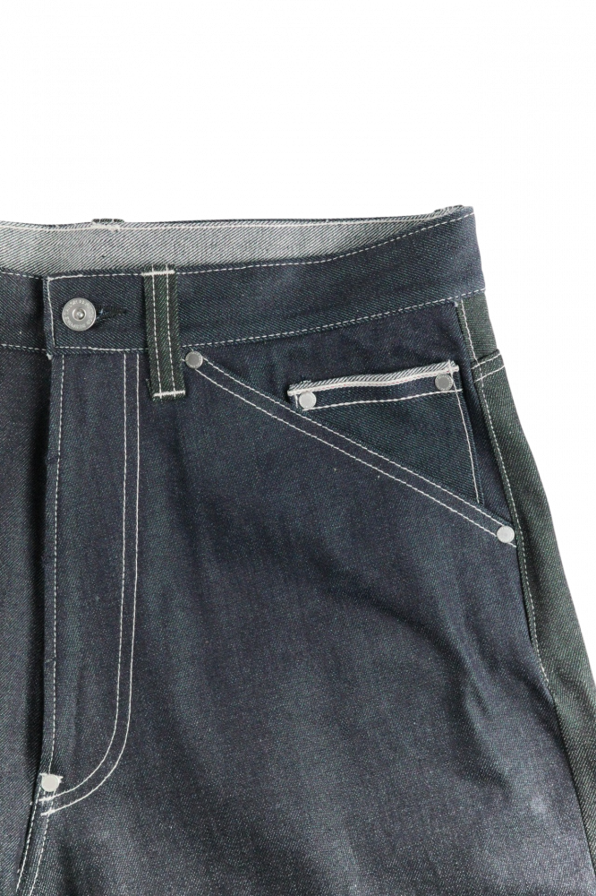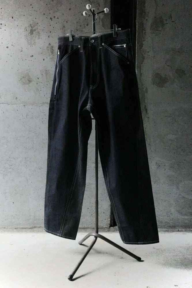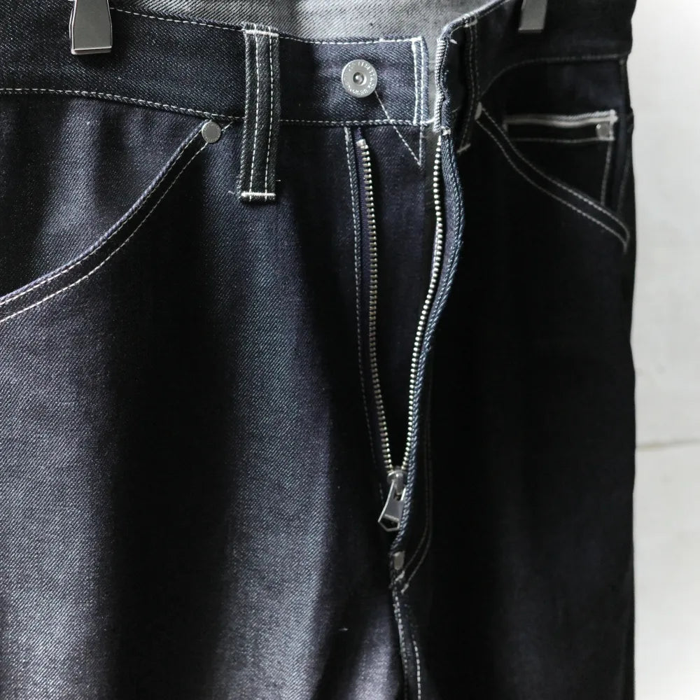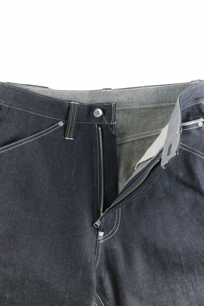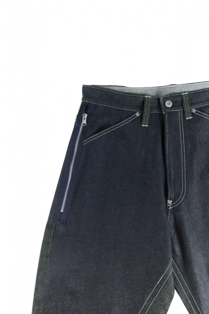 フロントはジッパーフライ、補強パーツはリベットを採用。右サイドのジッパーは背面に向かうポケットとなっています。