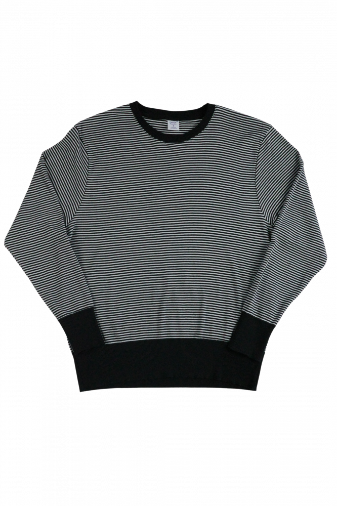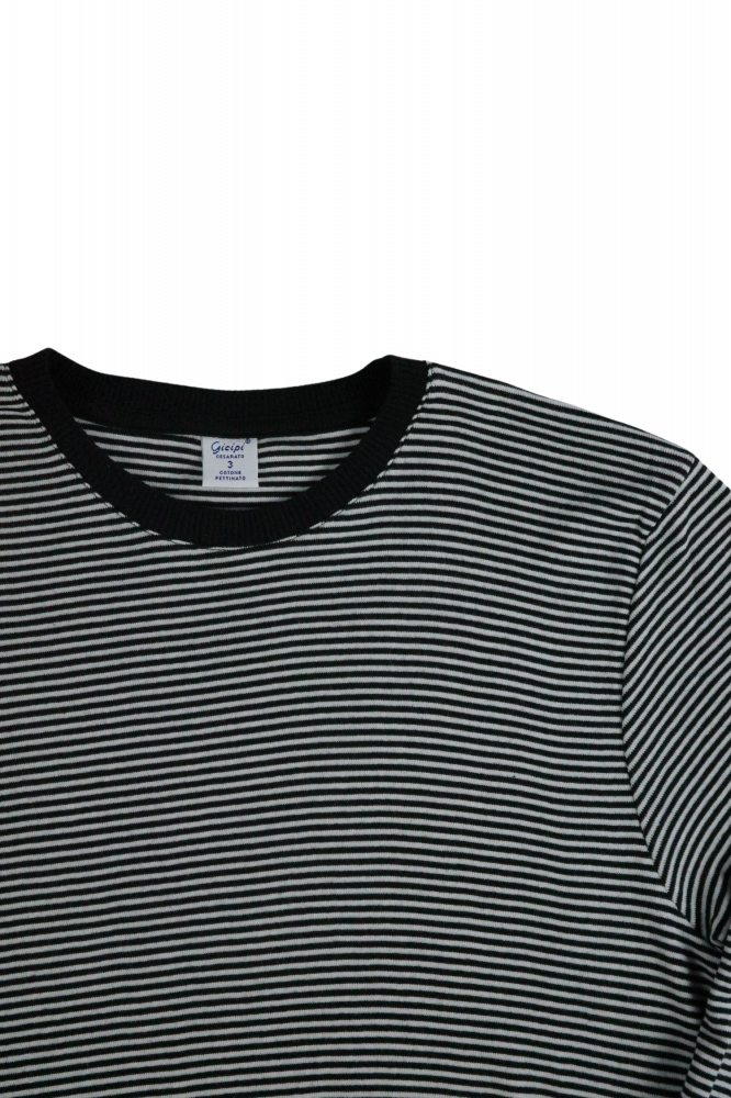 ネックも2×2のリブ仕様。首裏に伸び止めテープを配し、伸びや型崩れを軽減しています。