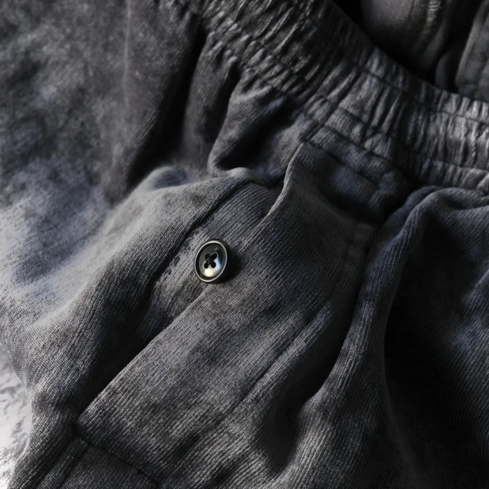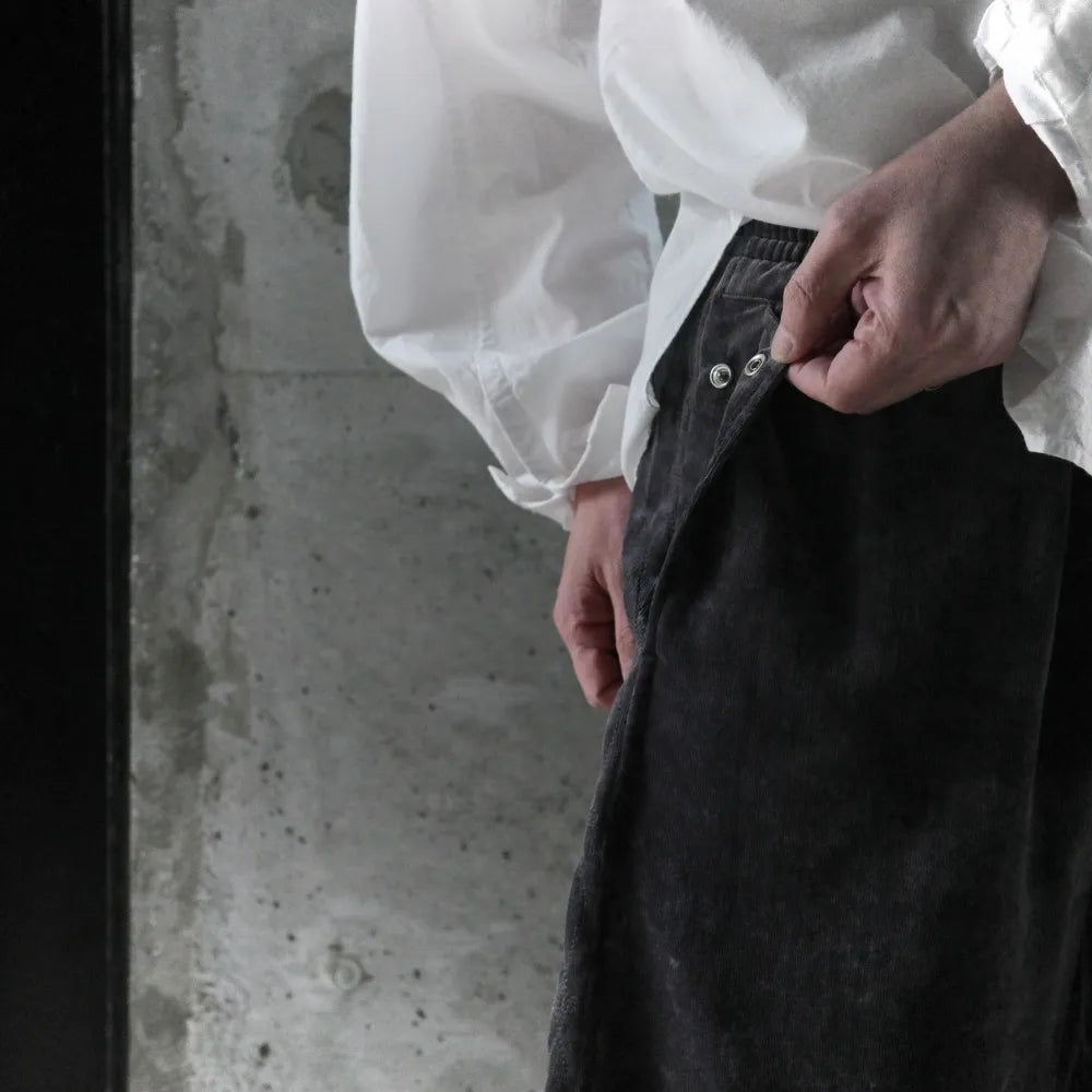素材の特性を活かし、ウエストはゴム+スピンドル仕様。滑らかで心地よい肌触りも相まって、リラックス感のある穿き心地となっています。イージー仕様ながらも、前立てはボタンで開閉。気の利いたディテールです。