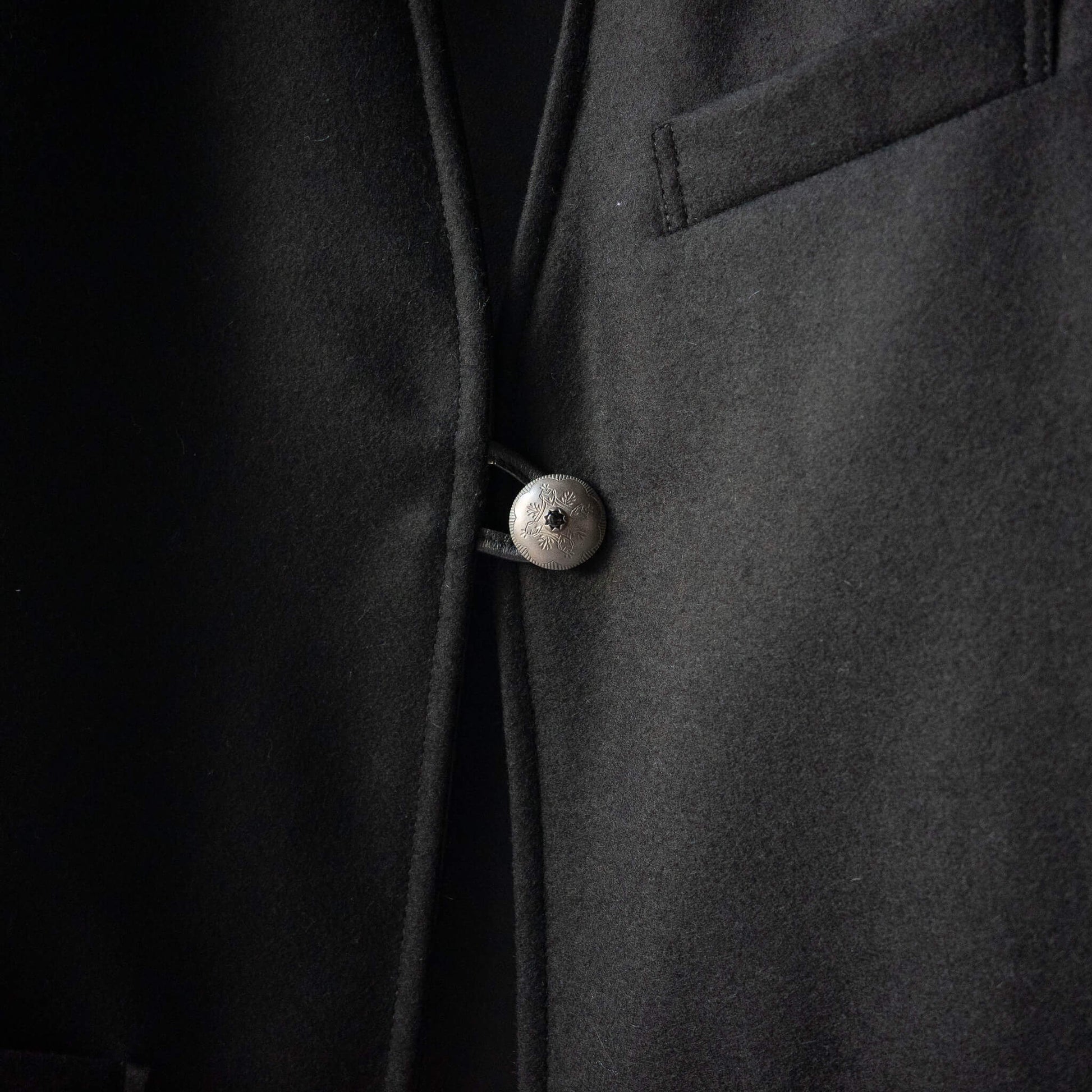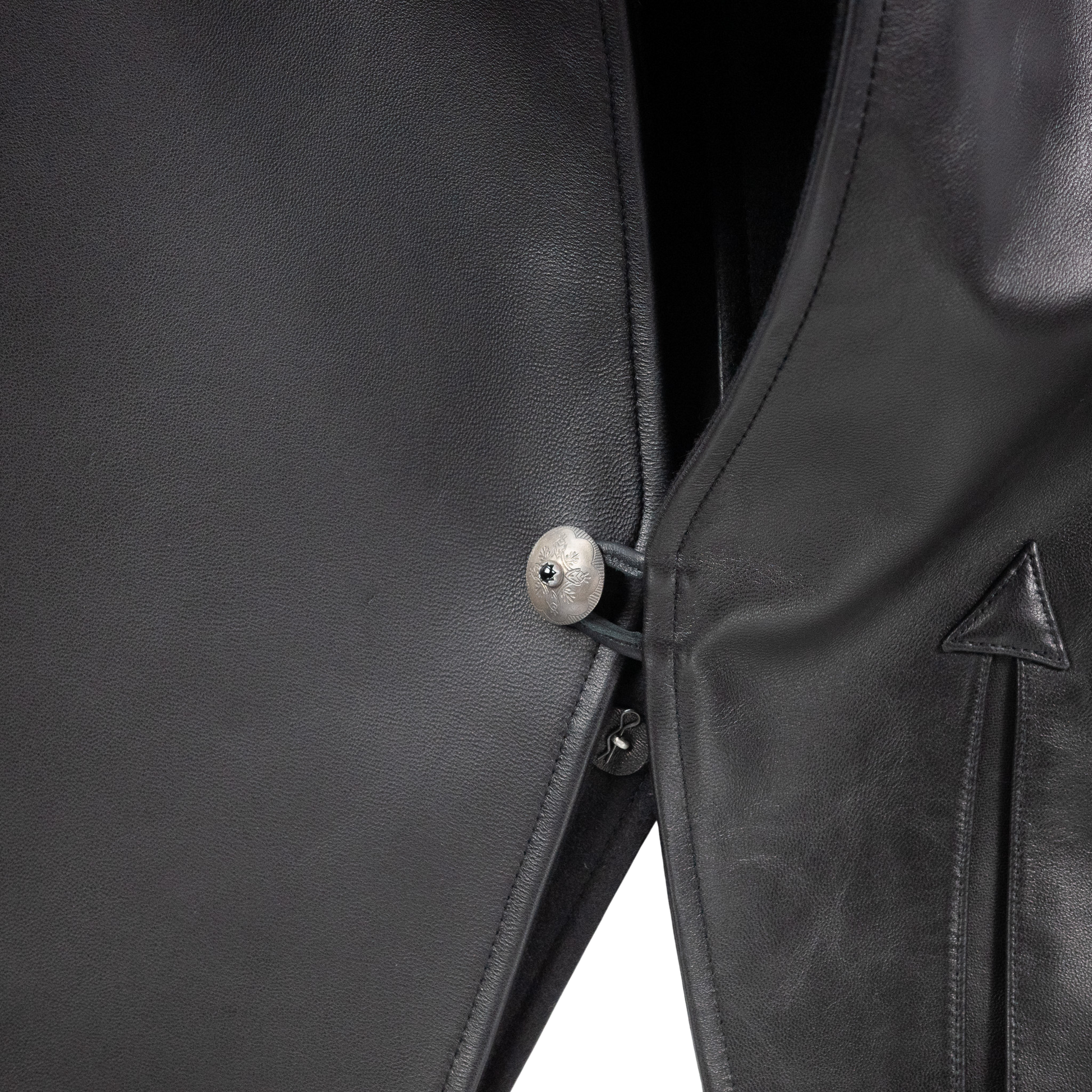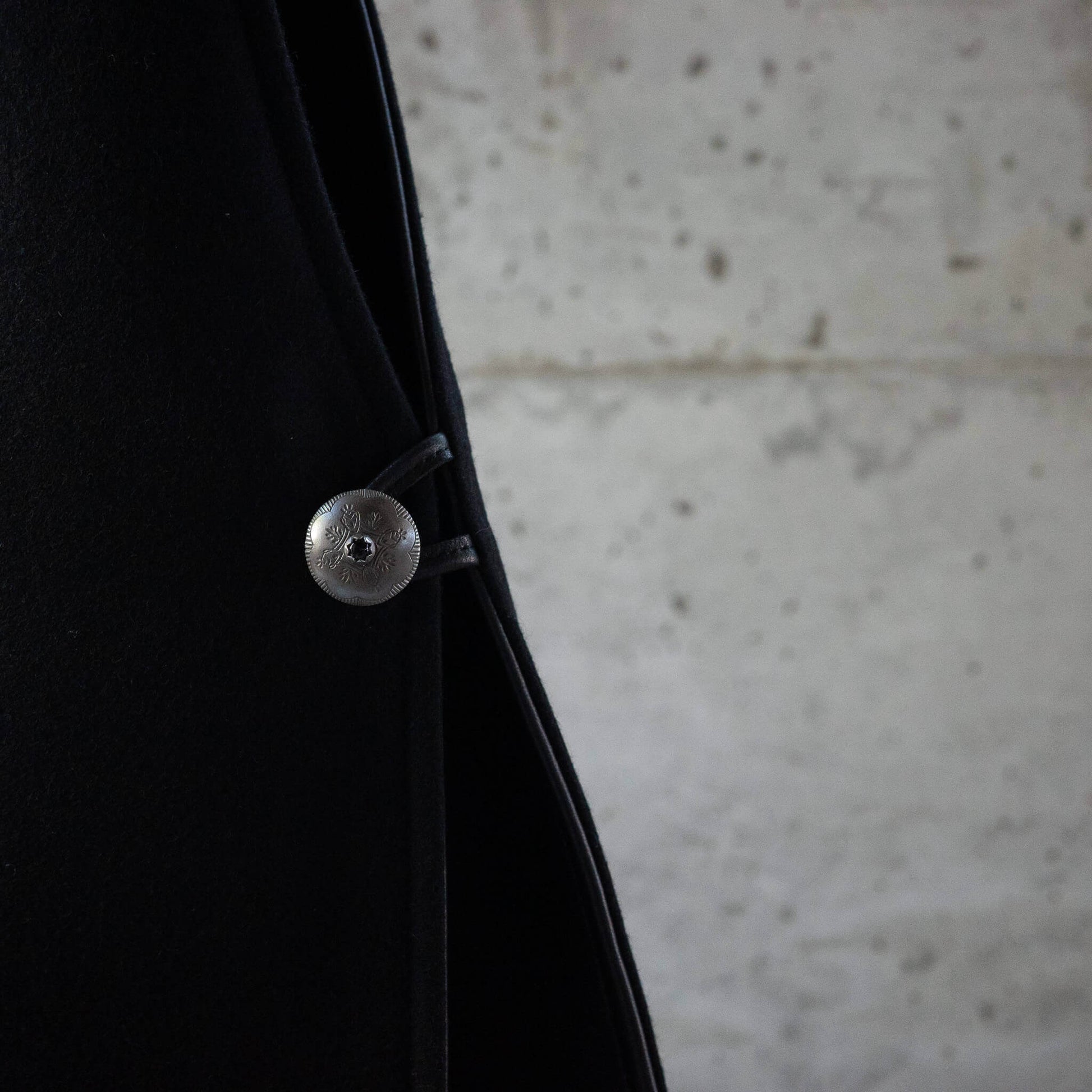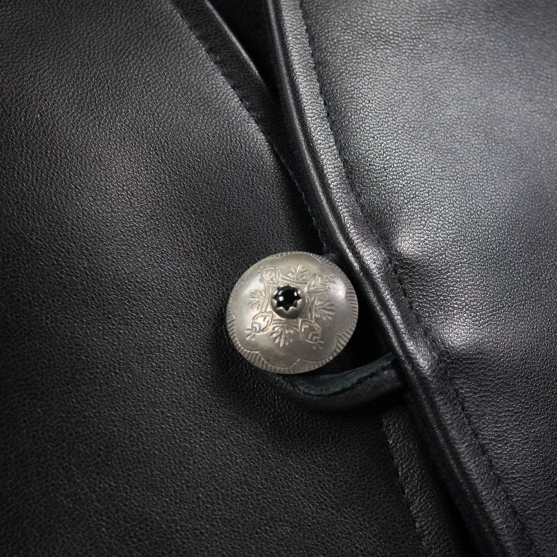 フロントを飾るのは、中央にオニキスを嵌め込んだピューター製コンチョボタン。軽量でありながら重厚感と繊細さを兼ね備えたこのボタンを、フロントと両サイドに三つ配することで、存在感が一層際立ちます。