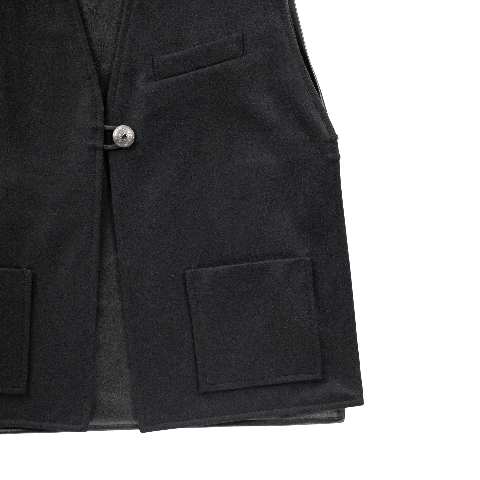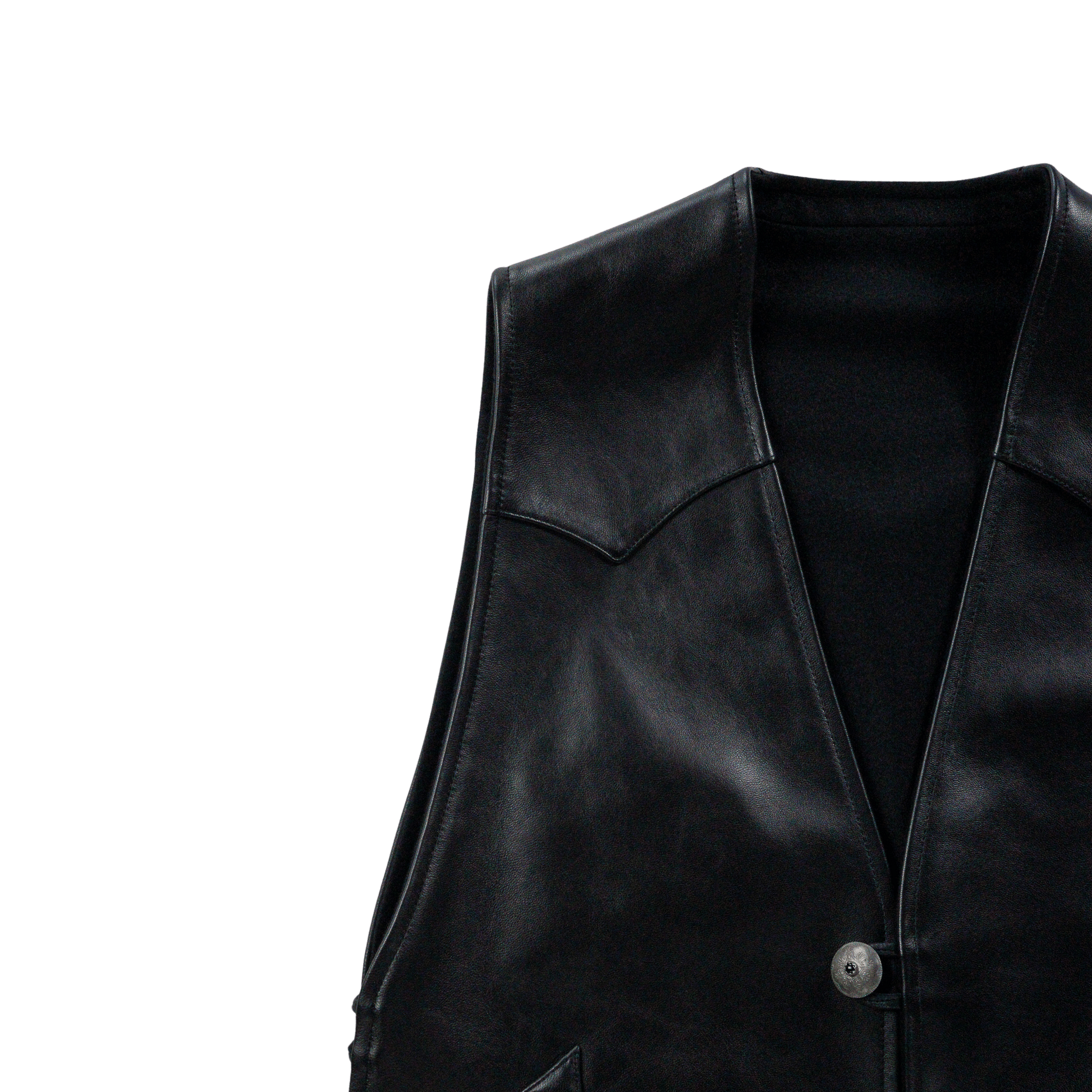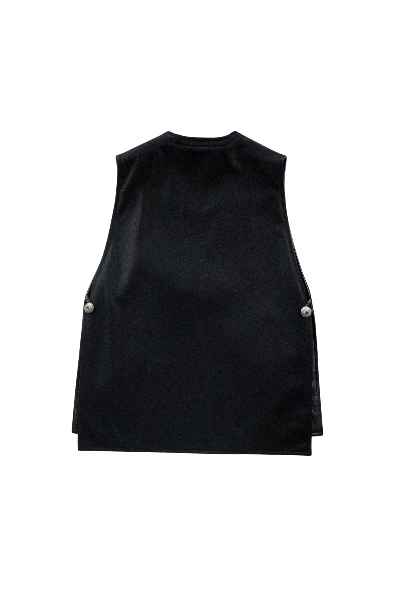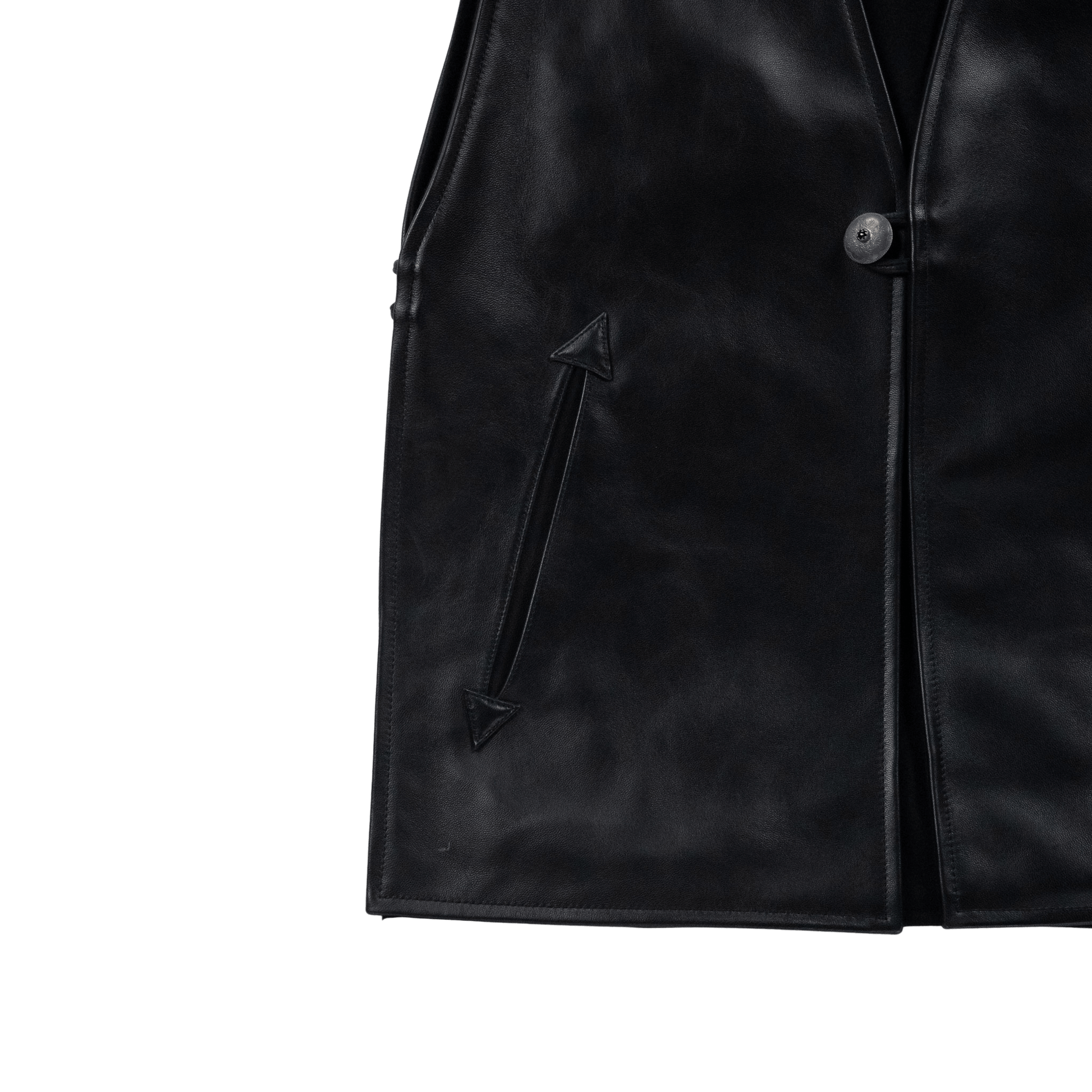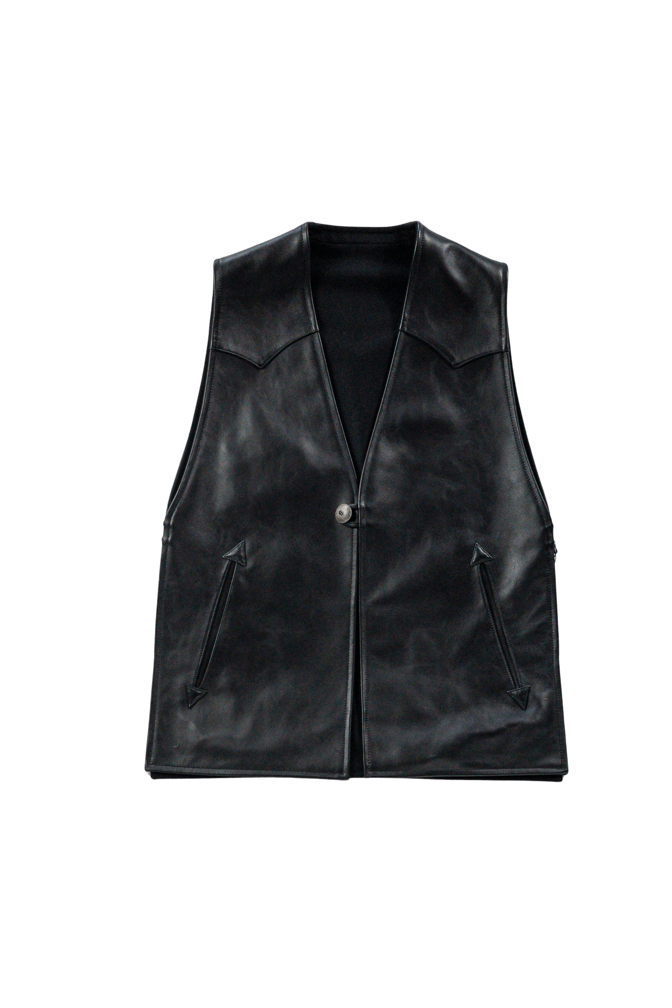 フロントを飾るのは、中央にオニキスを嵌め込んだピューター製コンチョボタン。軽量でありながら重厚感と繊細さを兼ね備えたこのボタンを、フロントと両サイドに三つ配することで、存在感が一層際立ちます。