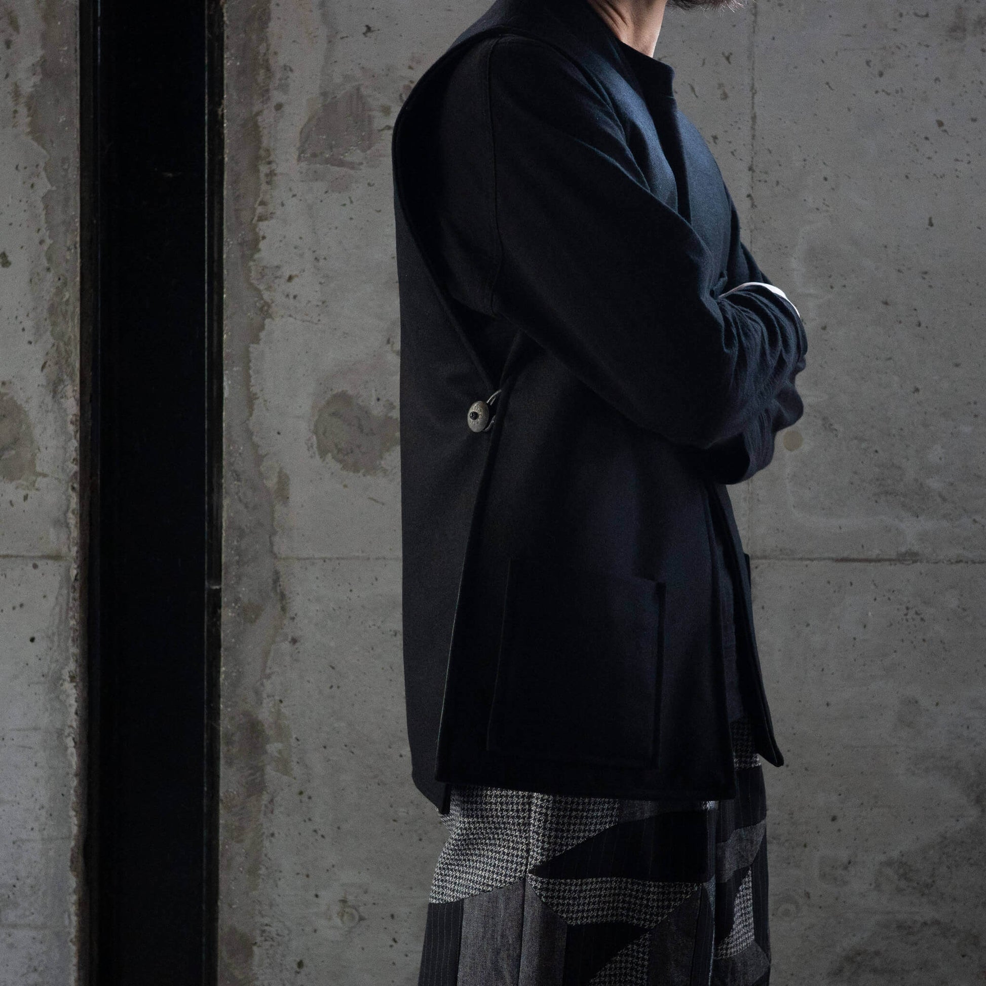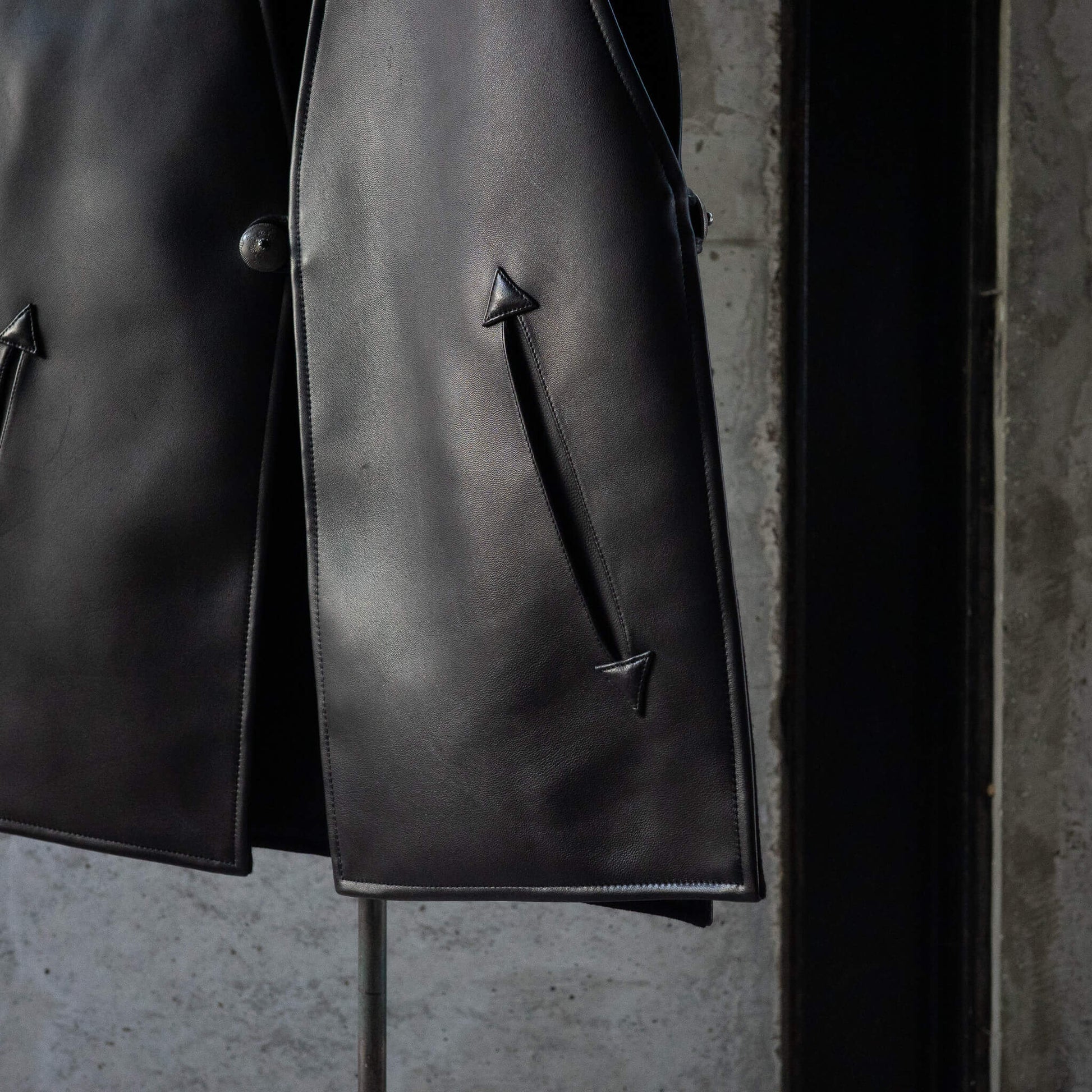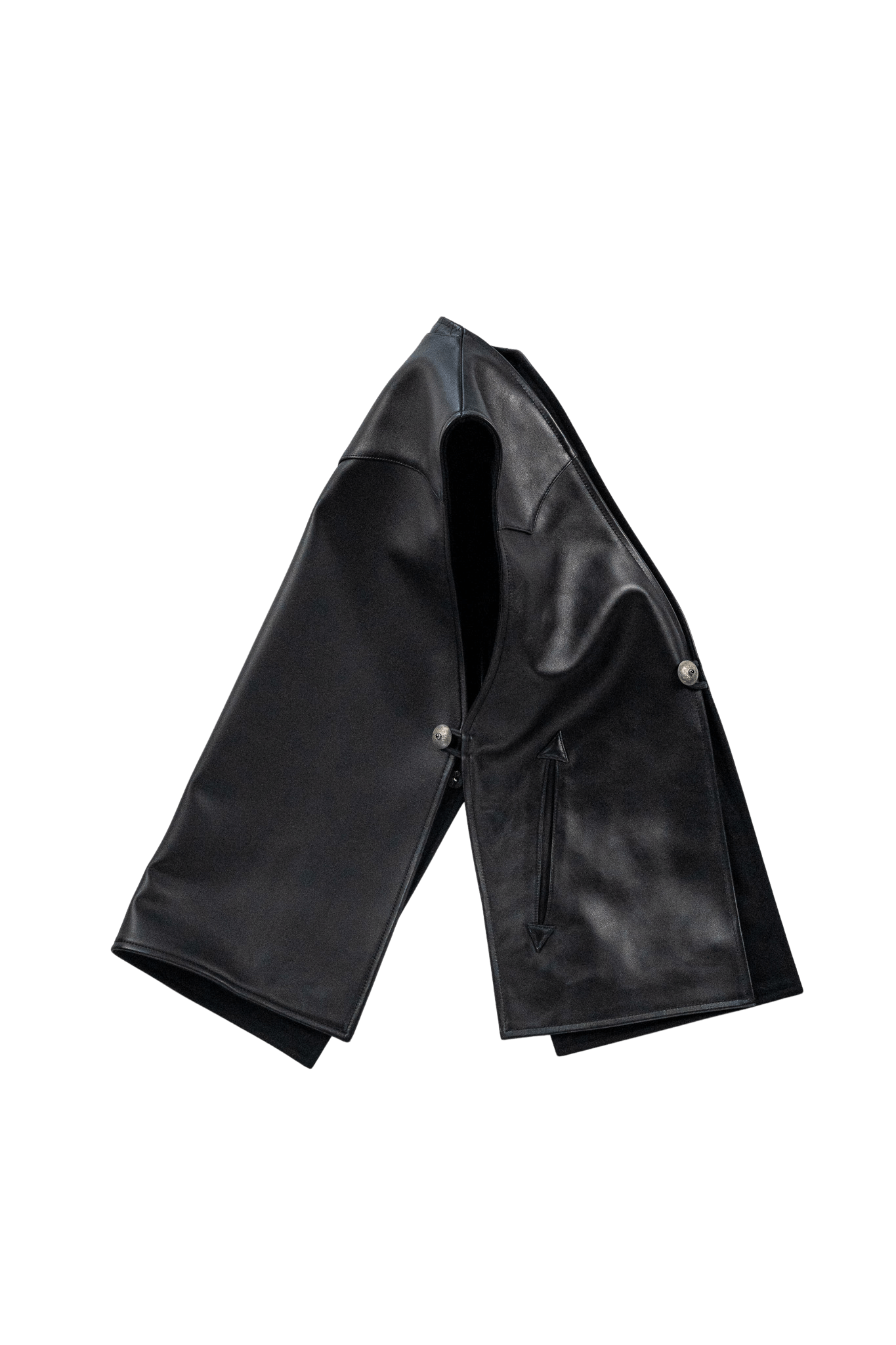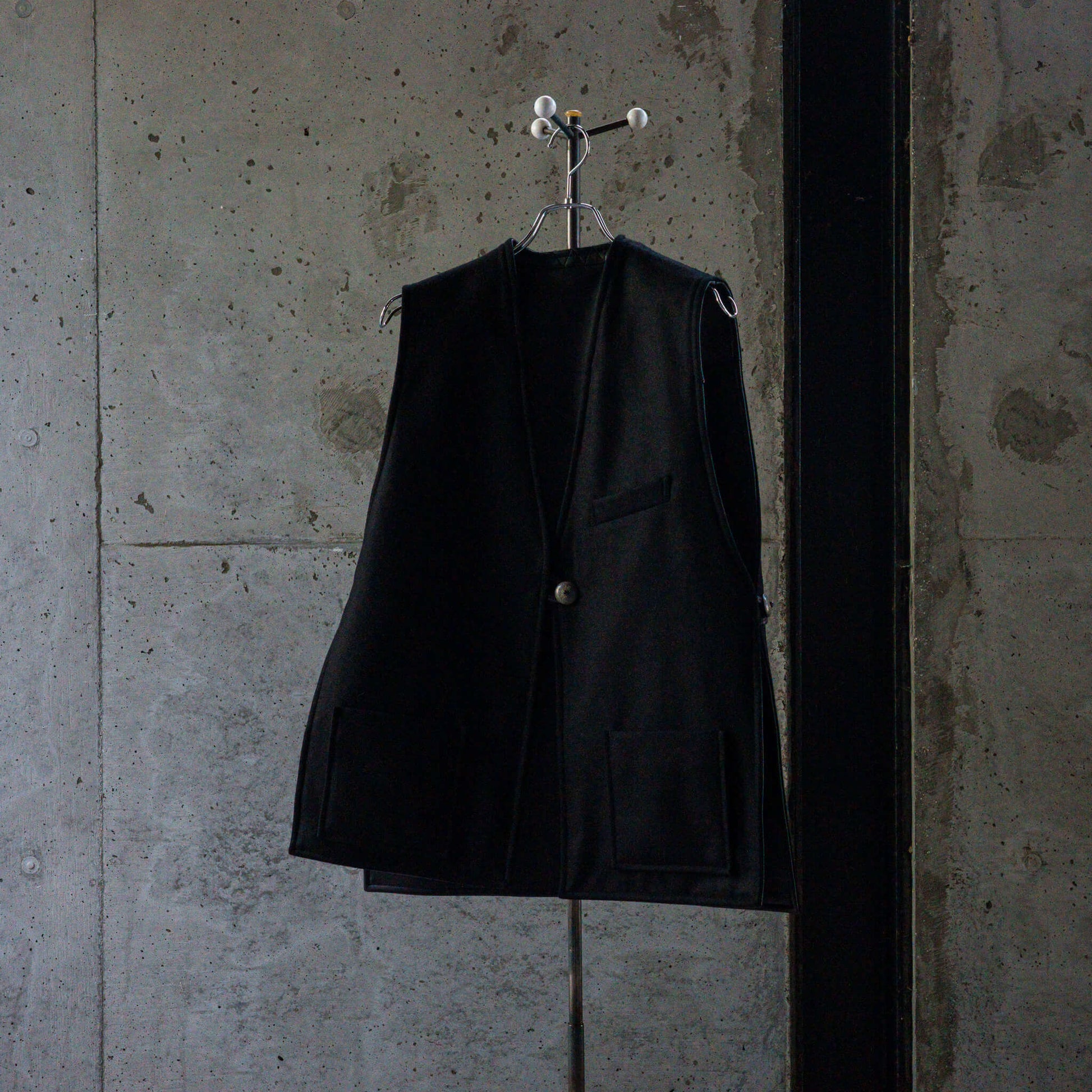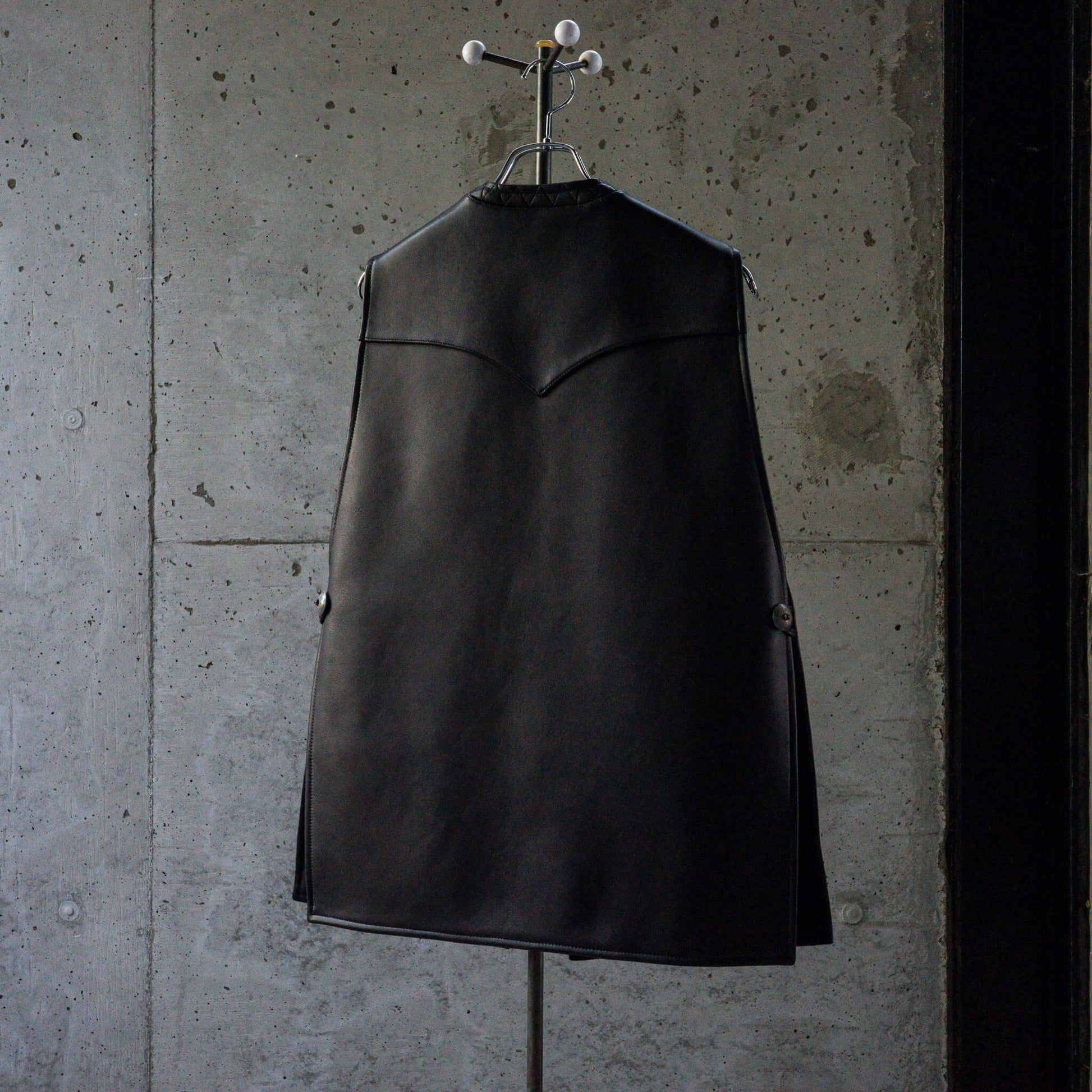 前身頃と後ろ身頃は肩で繋がれ、両サイドをコンチョボタンで固定する独特なデザイン。バサッと羽織る感覚で、ざっくりとしたプロポーションに仕上げられています。