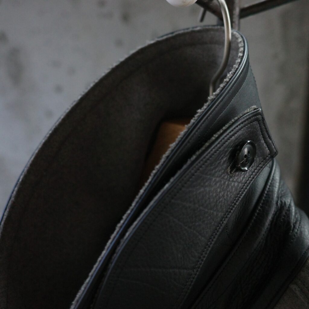 襟裏には上質なカーフレザーを配し、異素材によって生じるコントラストを良いバランスで表現しています。