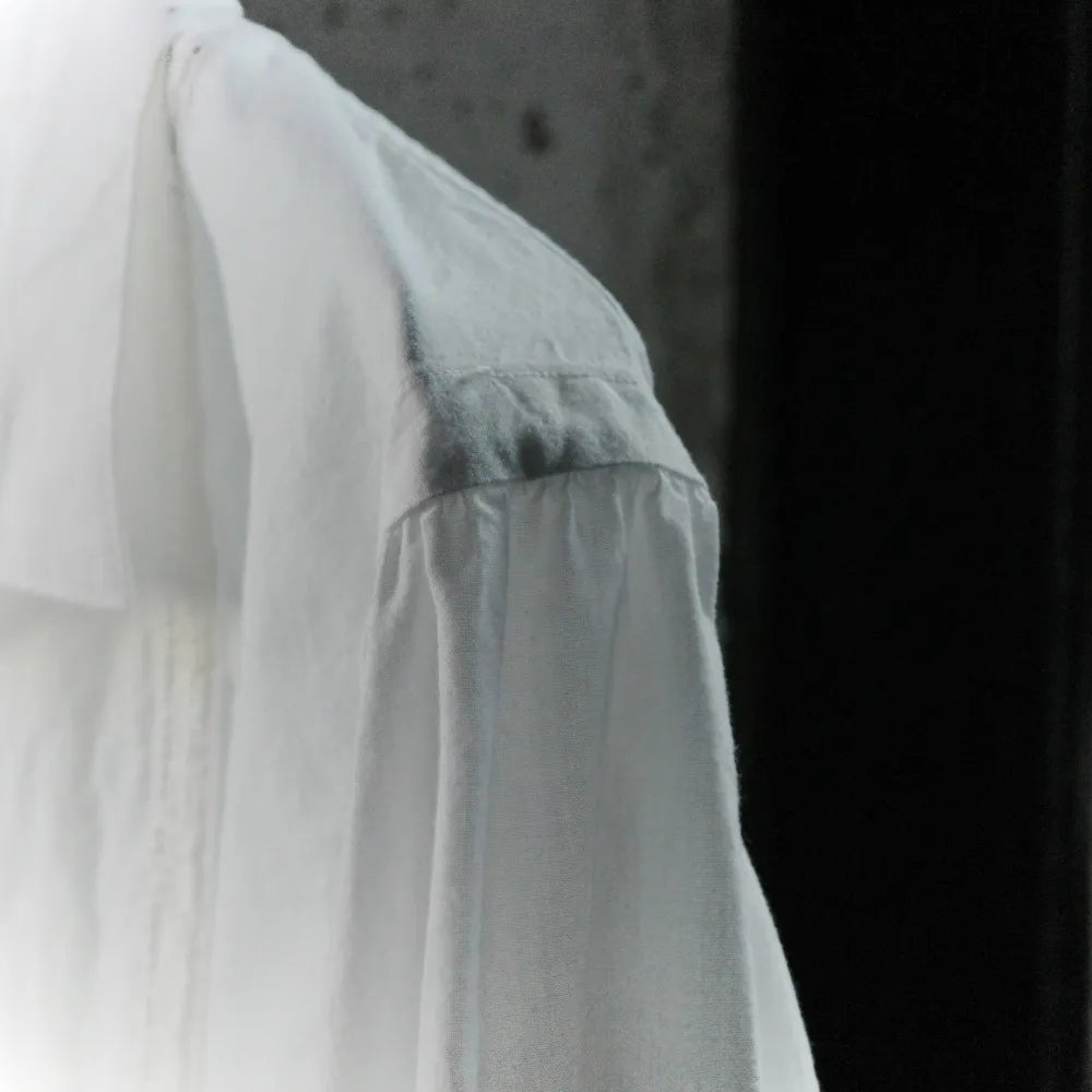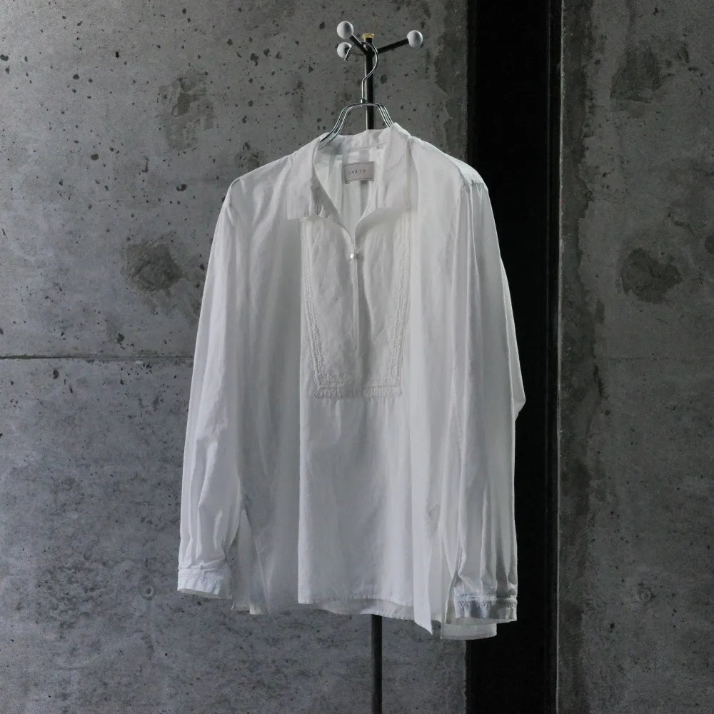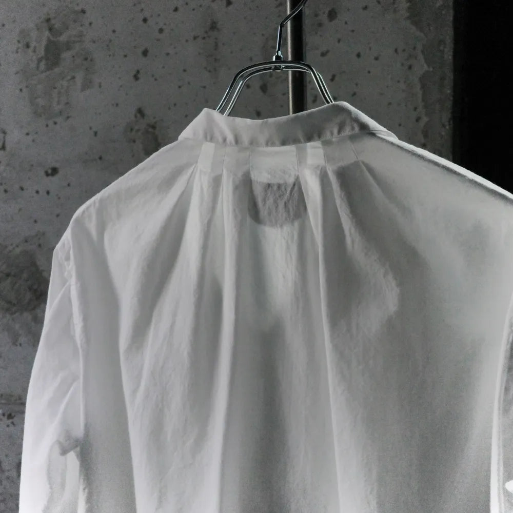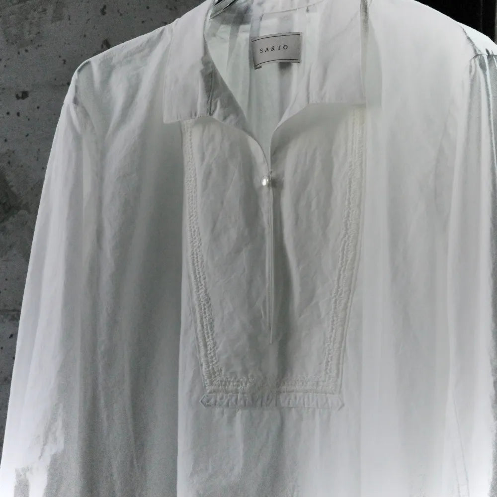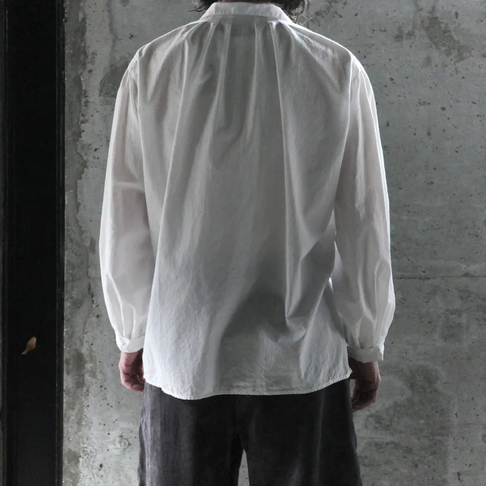 襟裏に配された放射状に広がるタックもSARTOのプルオーバーシャツの特徴のひとつです。