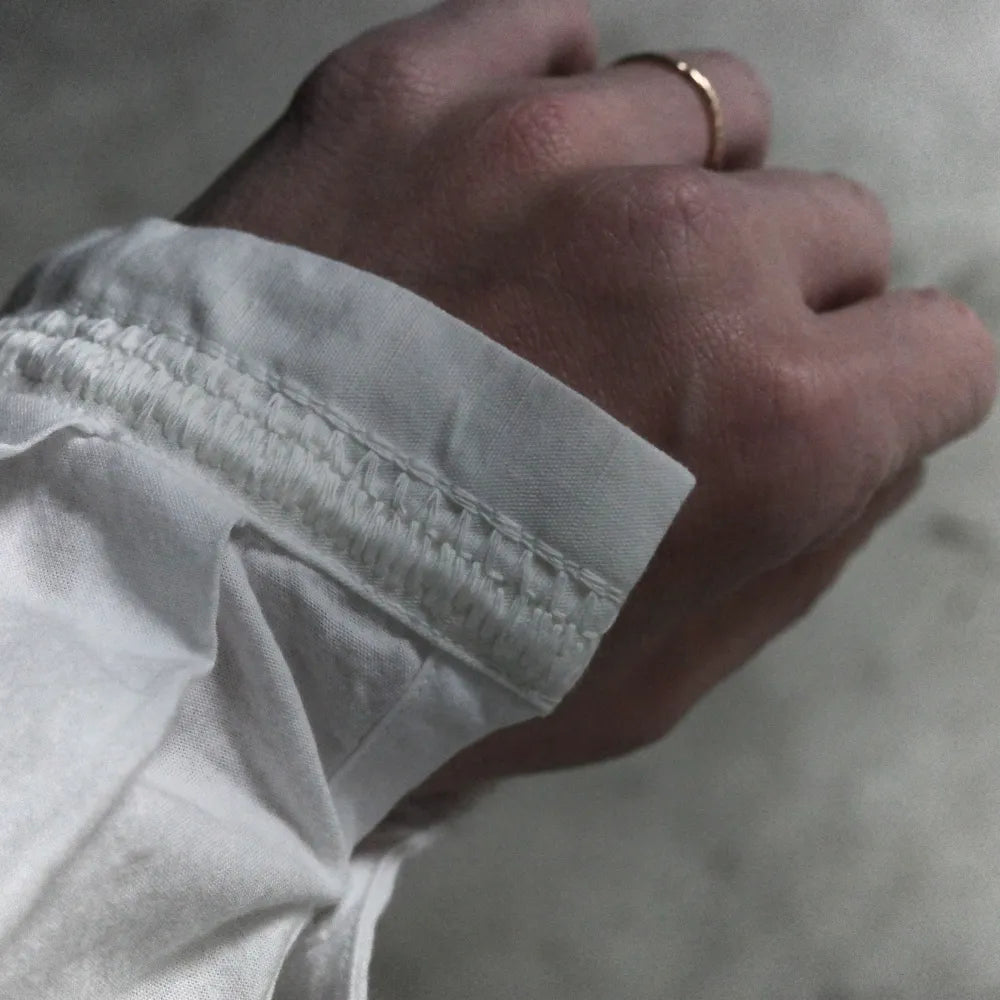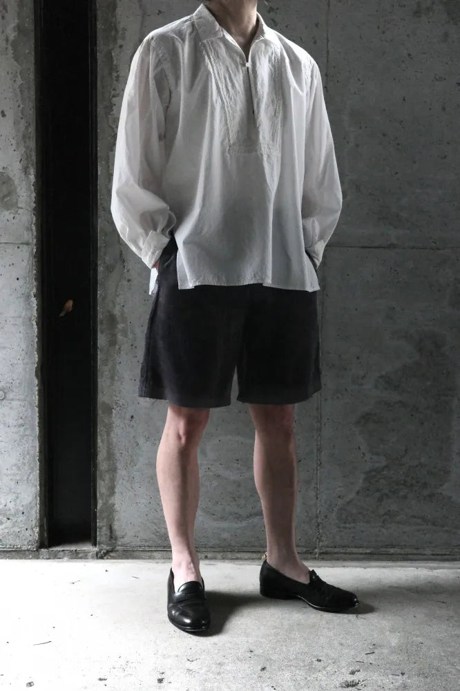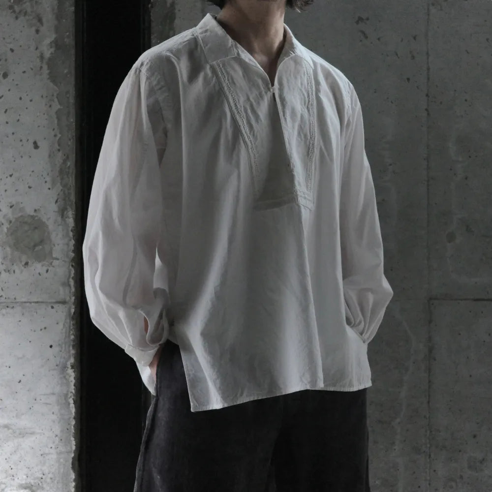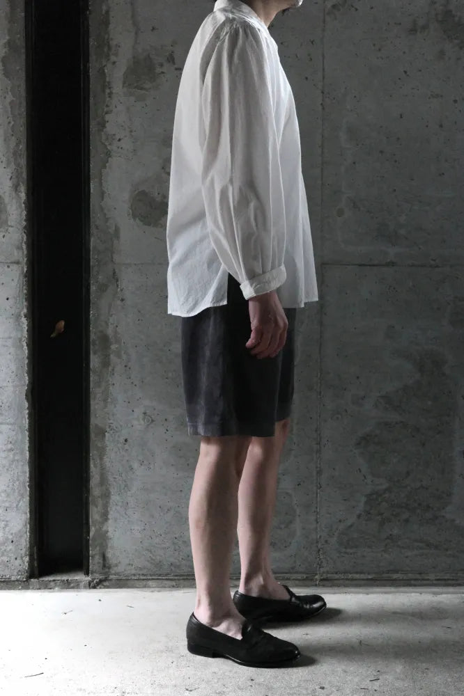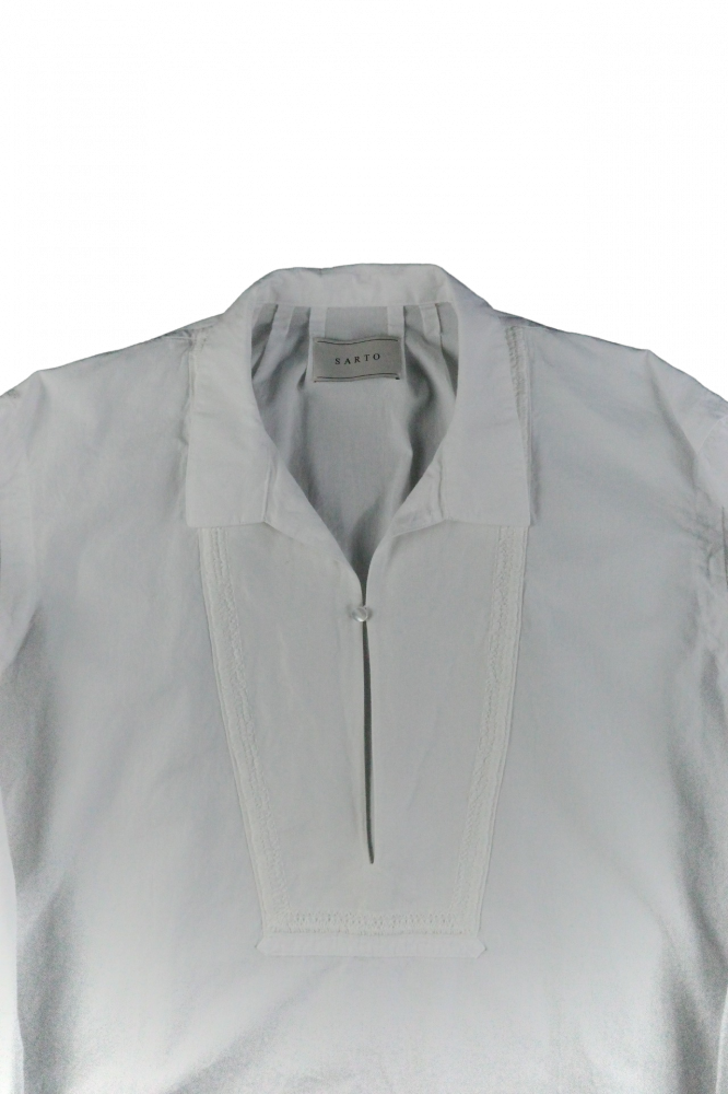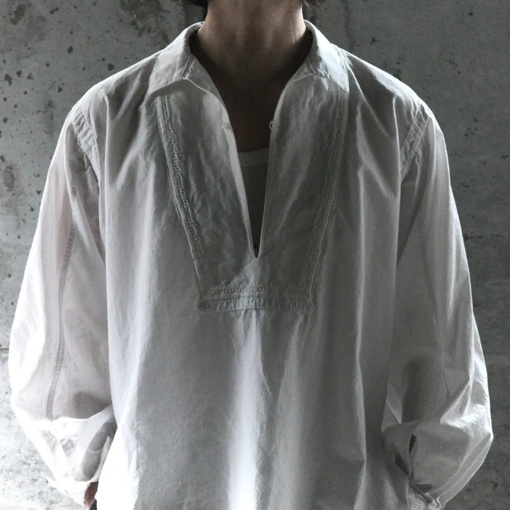 襟裏に配された放射状に広がるタックもSARTOのプルオーバーシャツの特徴のひとつです。
