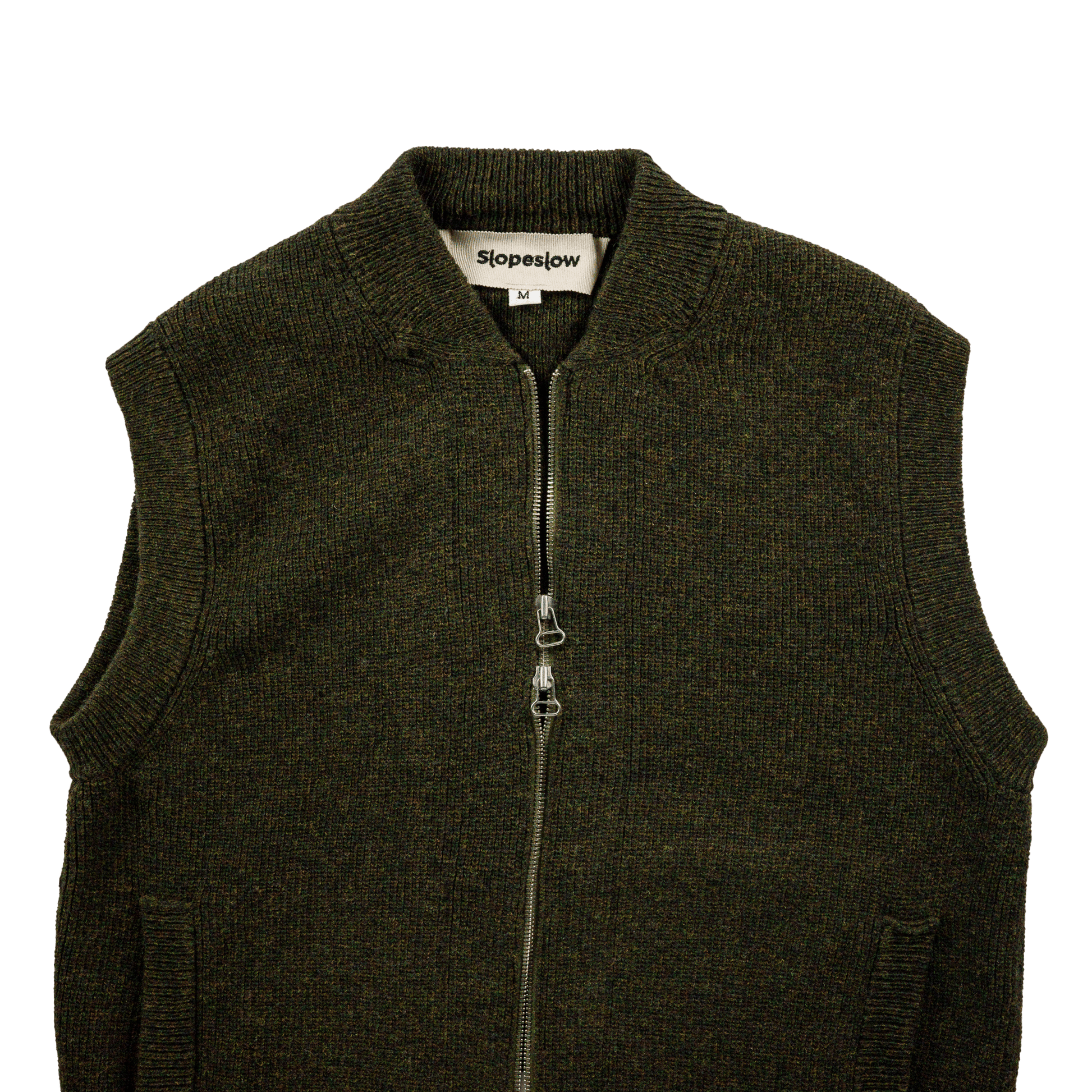 Slopeslowを代表するオリジナル素材「Hard Twisted Shetland Wool」を使用したジップフロントベスト。