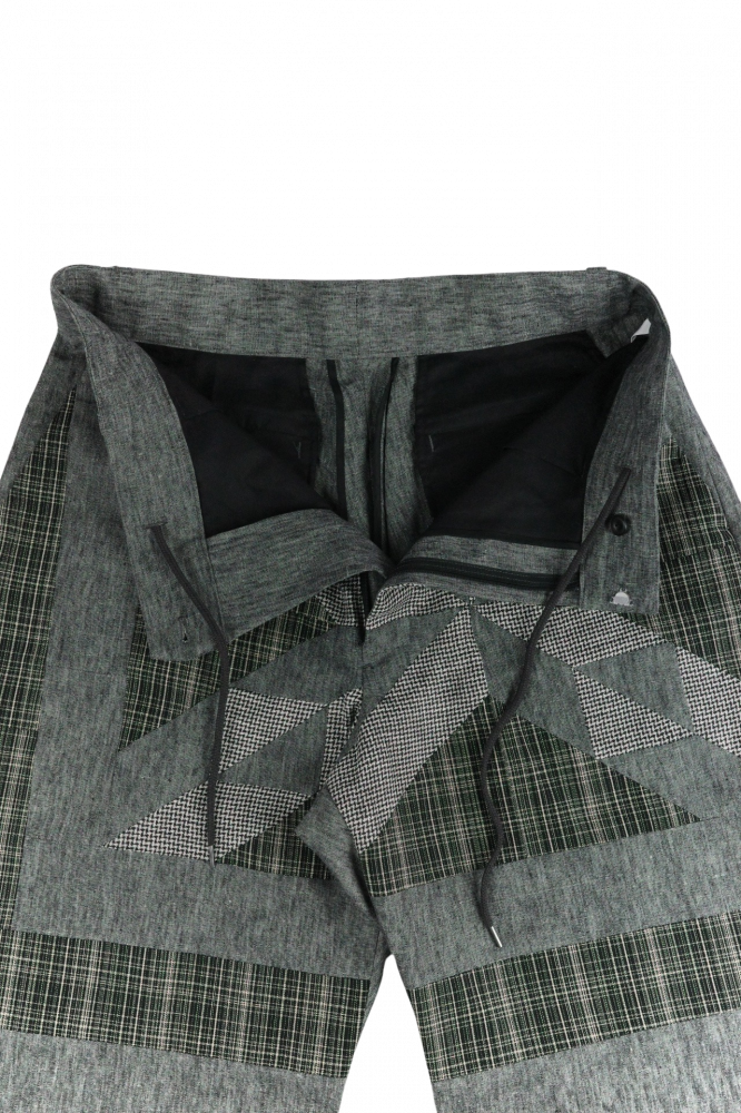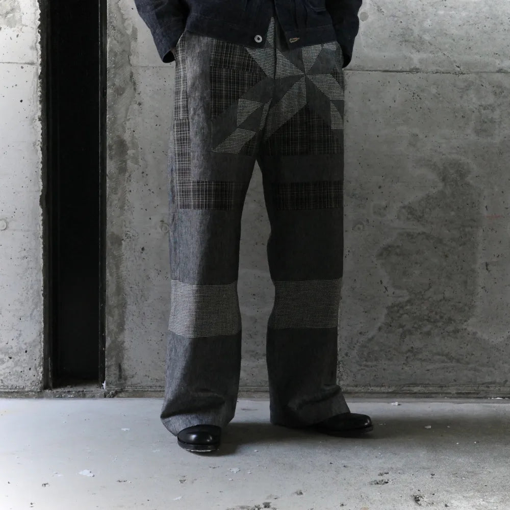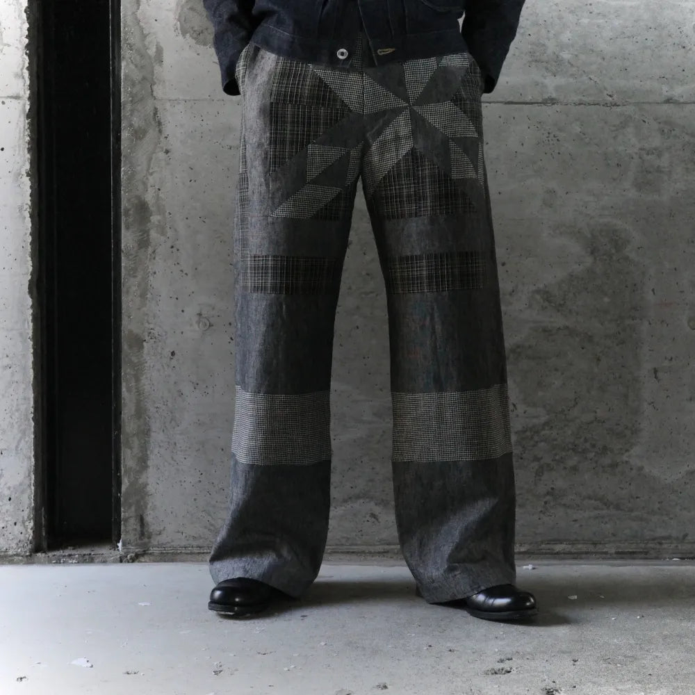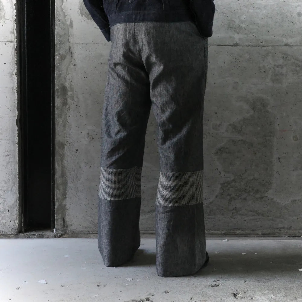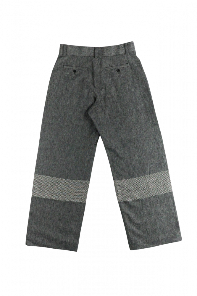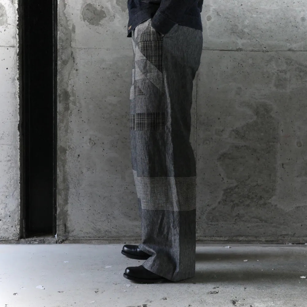 グレーベースのリネン74%×ポリエステル26%の生地に、リネン100%と、コットン95%×リネン5%の生地で構築したノータックのストレートパンツ。