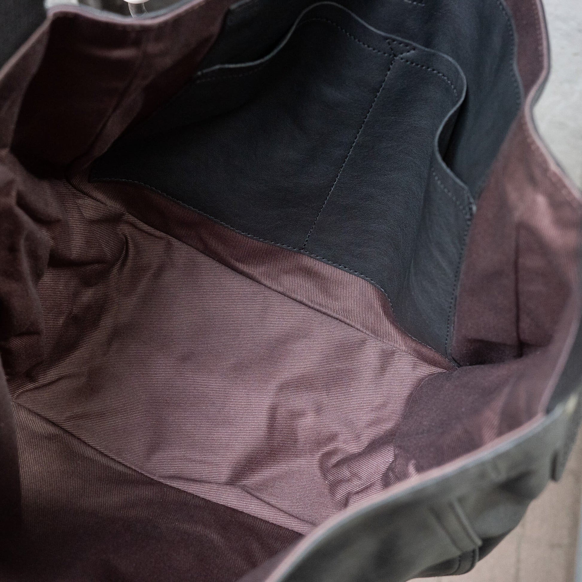 裏地はコットンライニング。内部には仕切りを備えたレザーパッチポケットを配しています。
