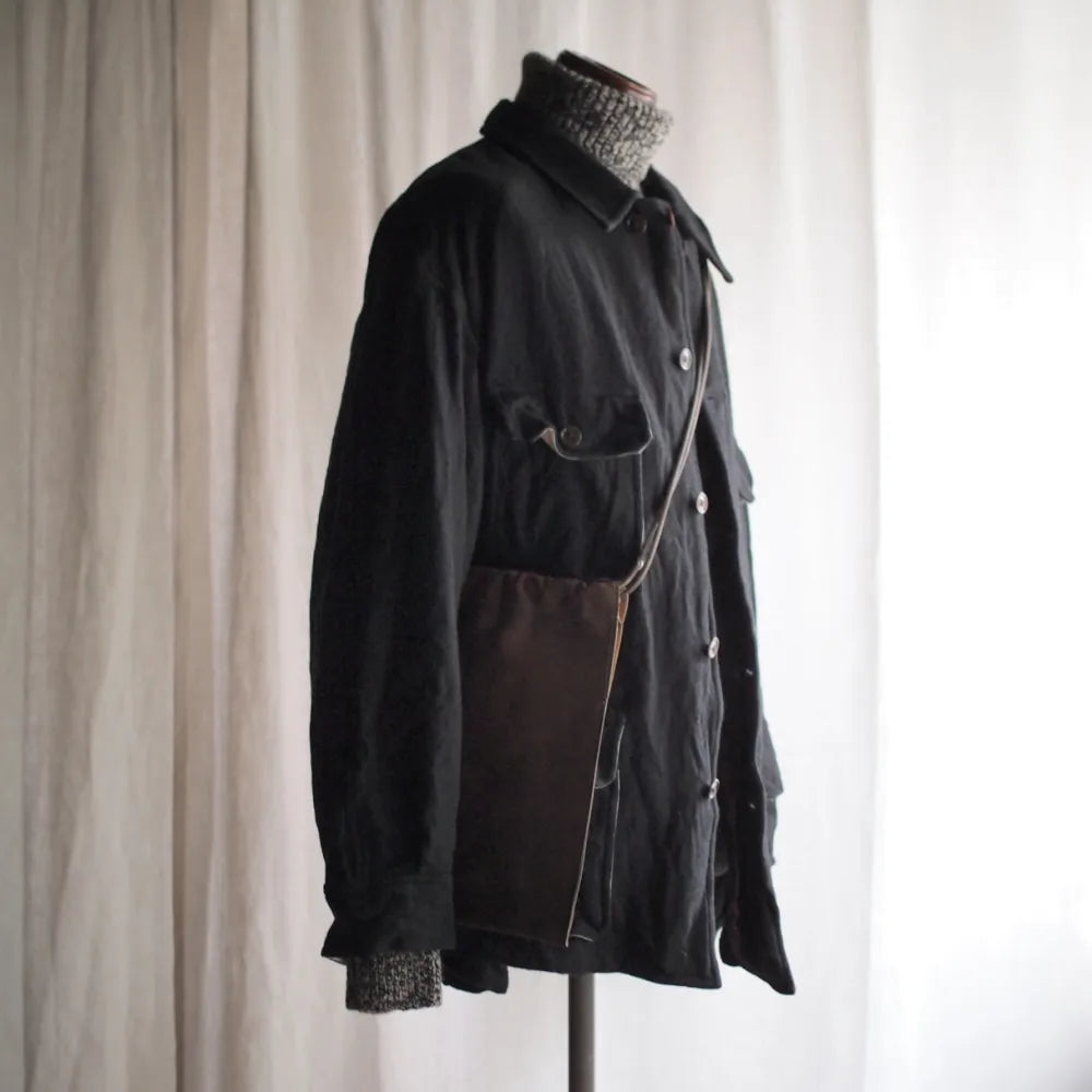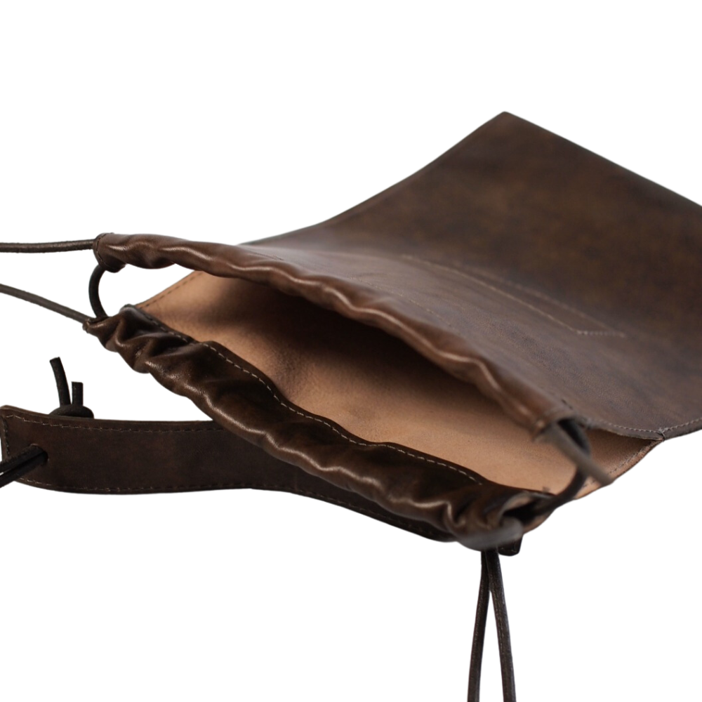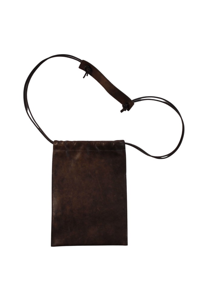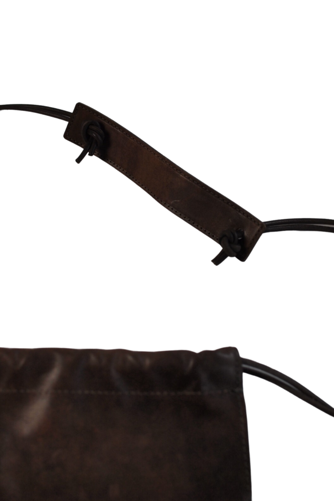 シンプルな巾着型のバッグにクラッタレザー(コードバンレザーに近しい部位)を乗せるという贅沢仕様。こちらもブランドらしい仕上がりのバッグとなっています。