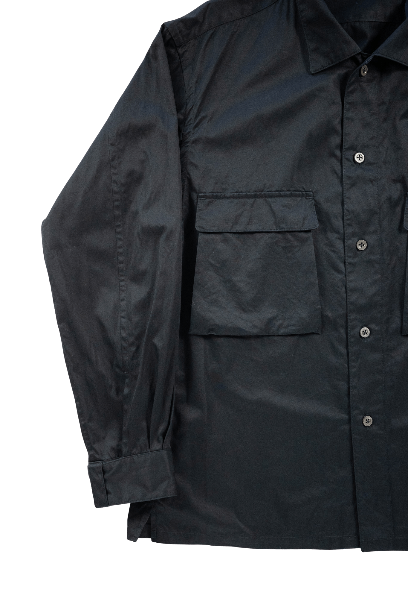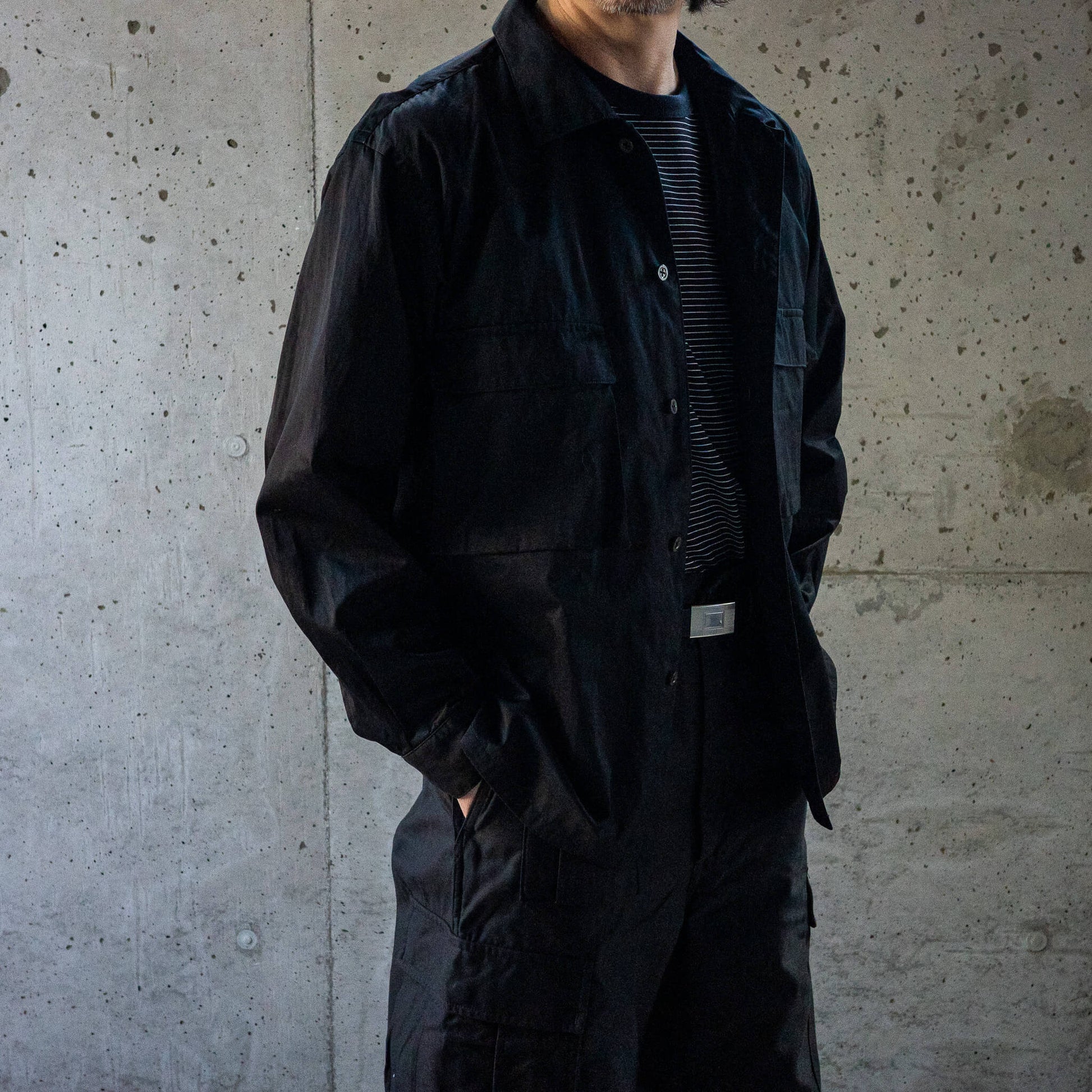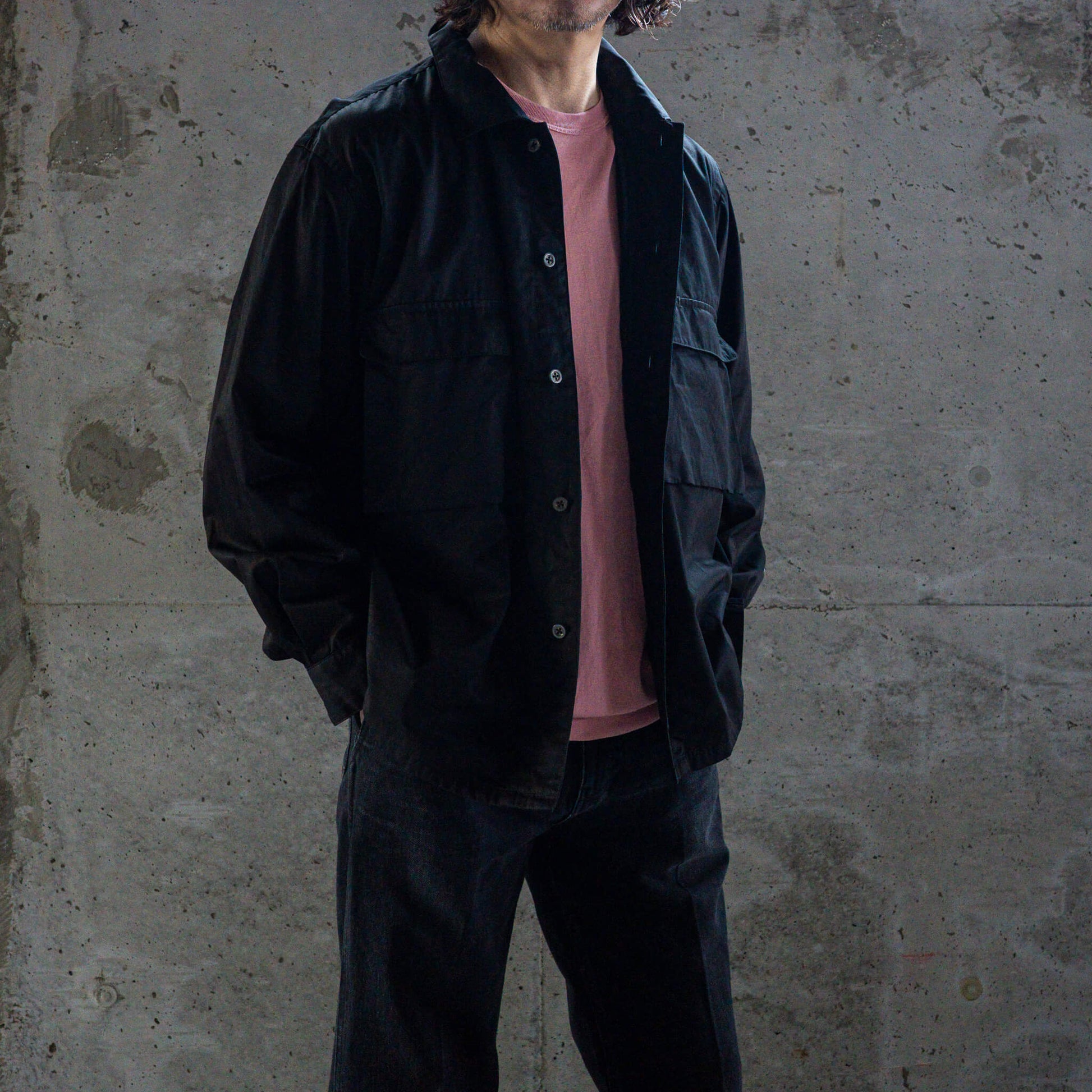 袖口にはシャツでは珍しいストラップ付きカフスを採用し、ゆとりあるプロポーションでシャツジャケットとしても活躍します。