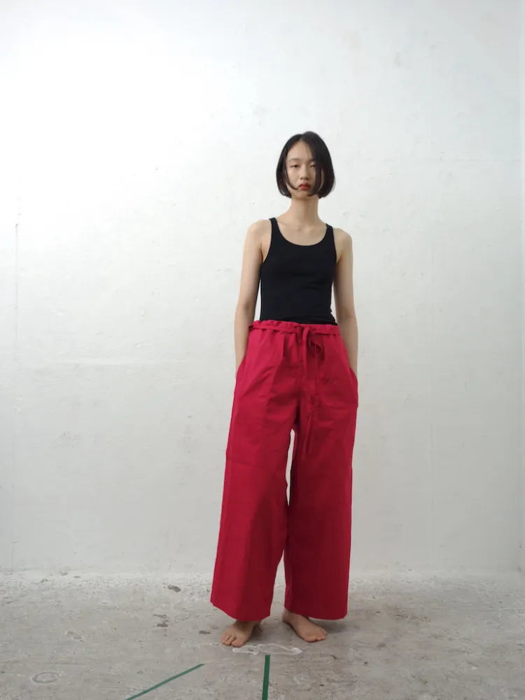 直線的なシルエットでミニマルなデザインでありながら、TUKIというランドカラーを強く感じられるスリーピングパンツ。