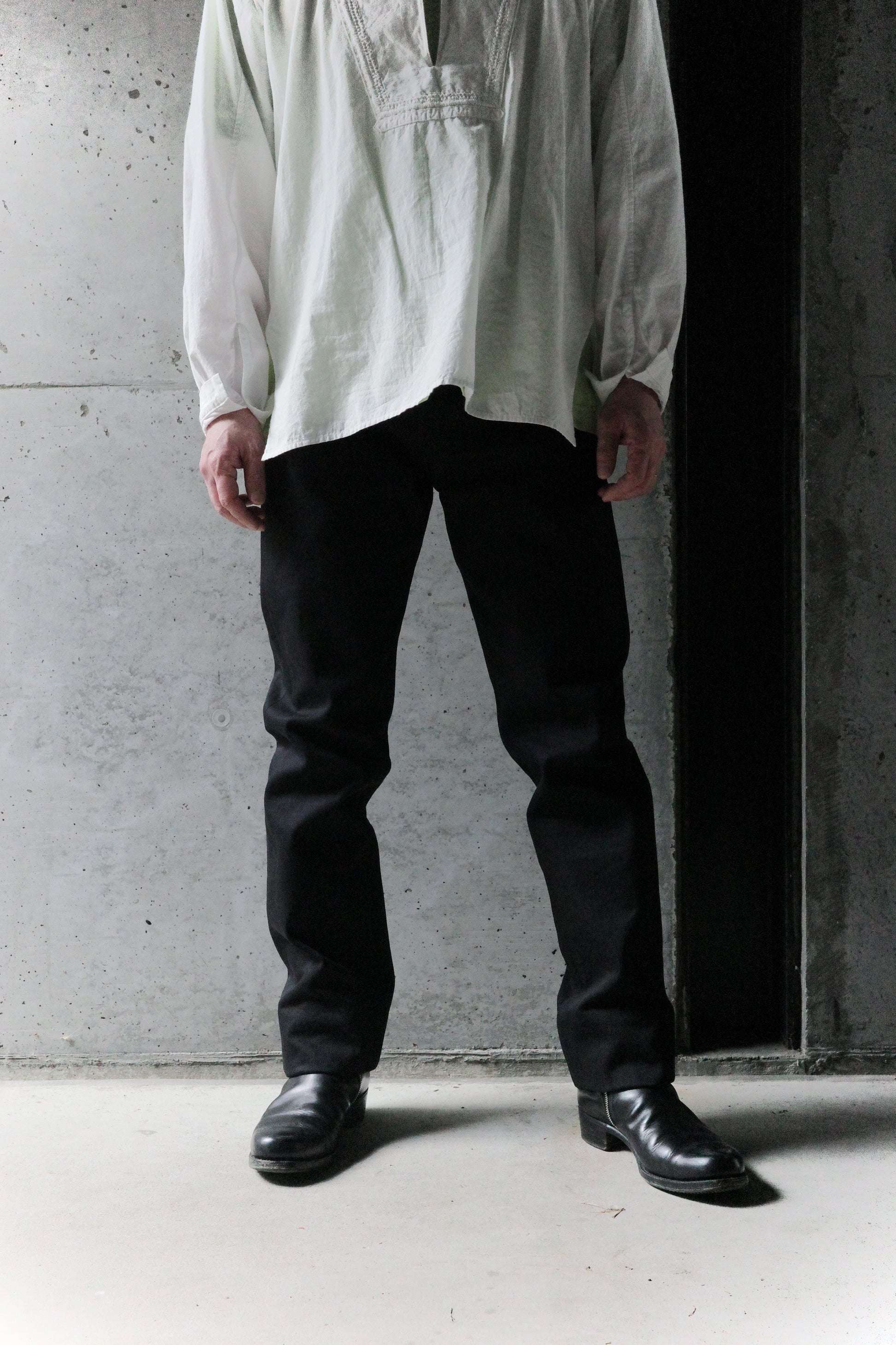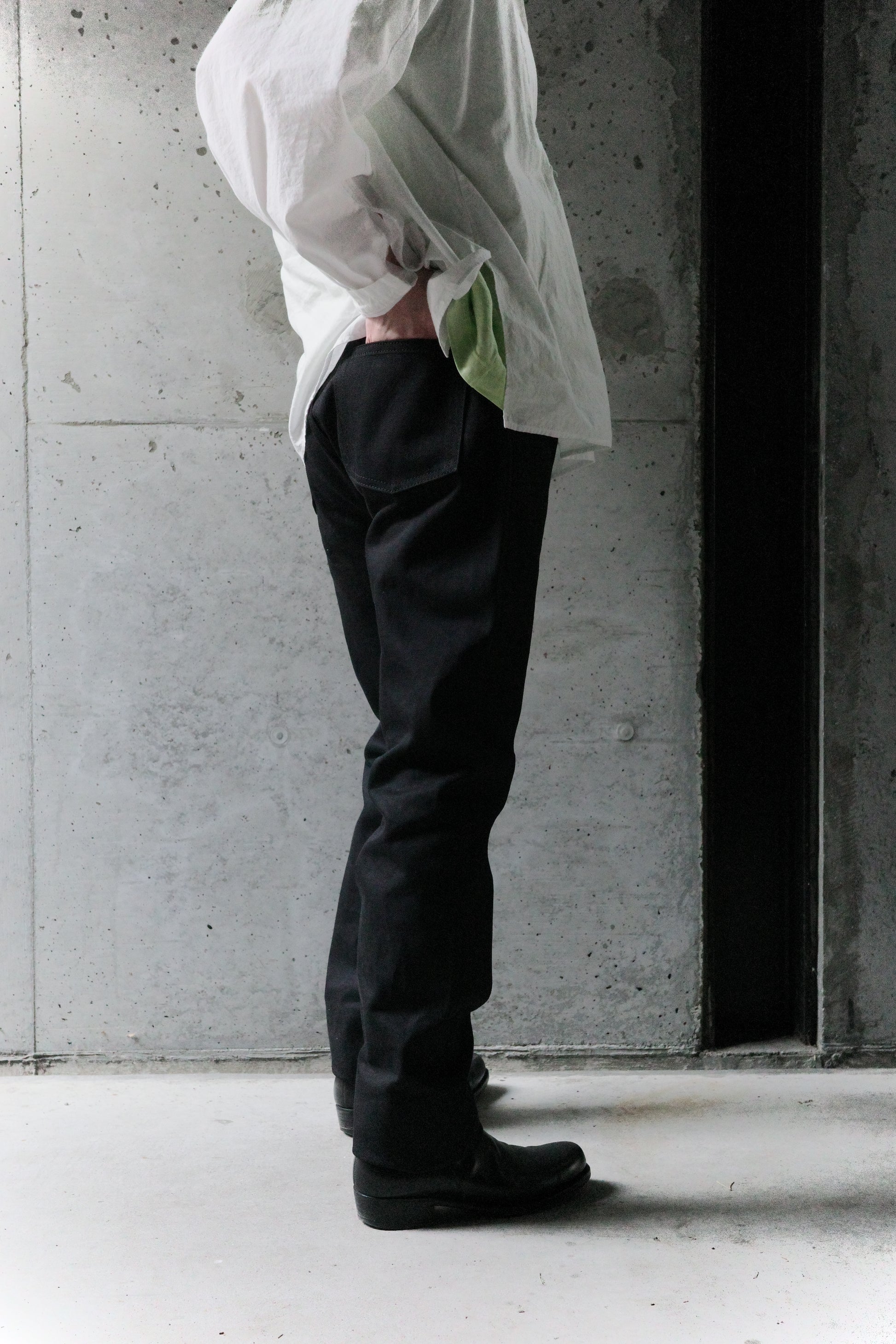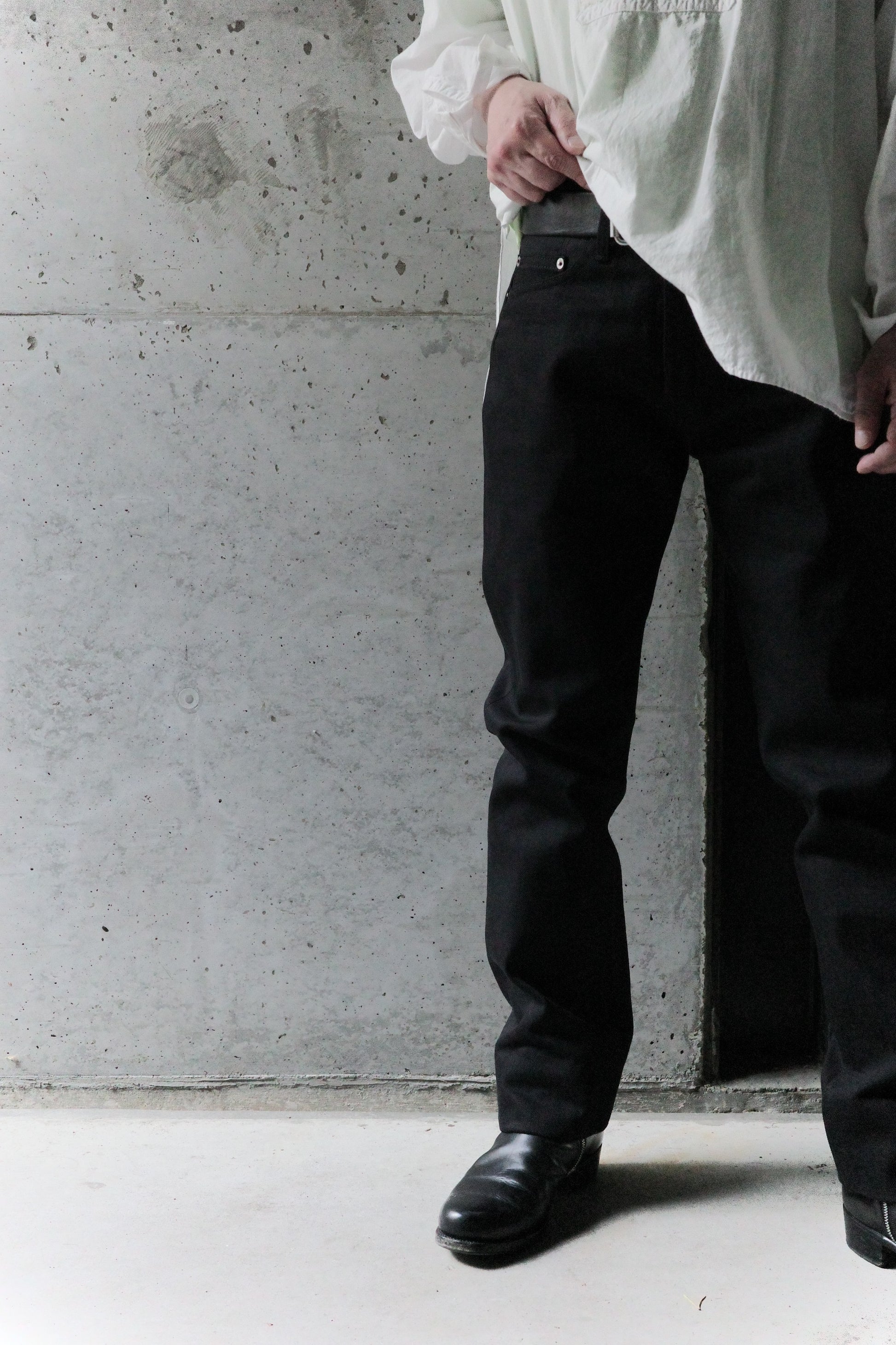 ブラック×ブラックの色合いは、穿き込むことで徐々にグレイッシュに褪せ、雰囲気のある表情へと育っていきます。