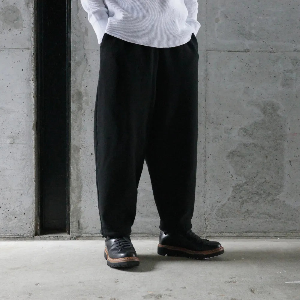 サルエルパンツのような独特なシルエットですが、長く取った股上のデザインによって股下に生地が触れることがなくリラックス感が凄い。更には分量感もありますので、膝抜けもそれ程影響しないかなと。ウエストゴムも緩すぎずキツすぎずな良バランスに仕上げられています。