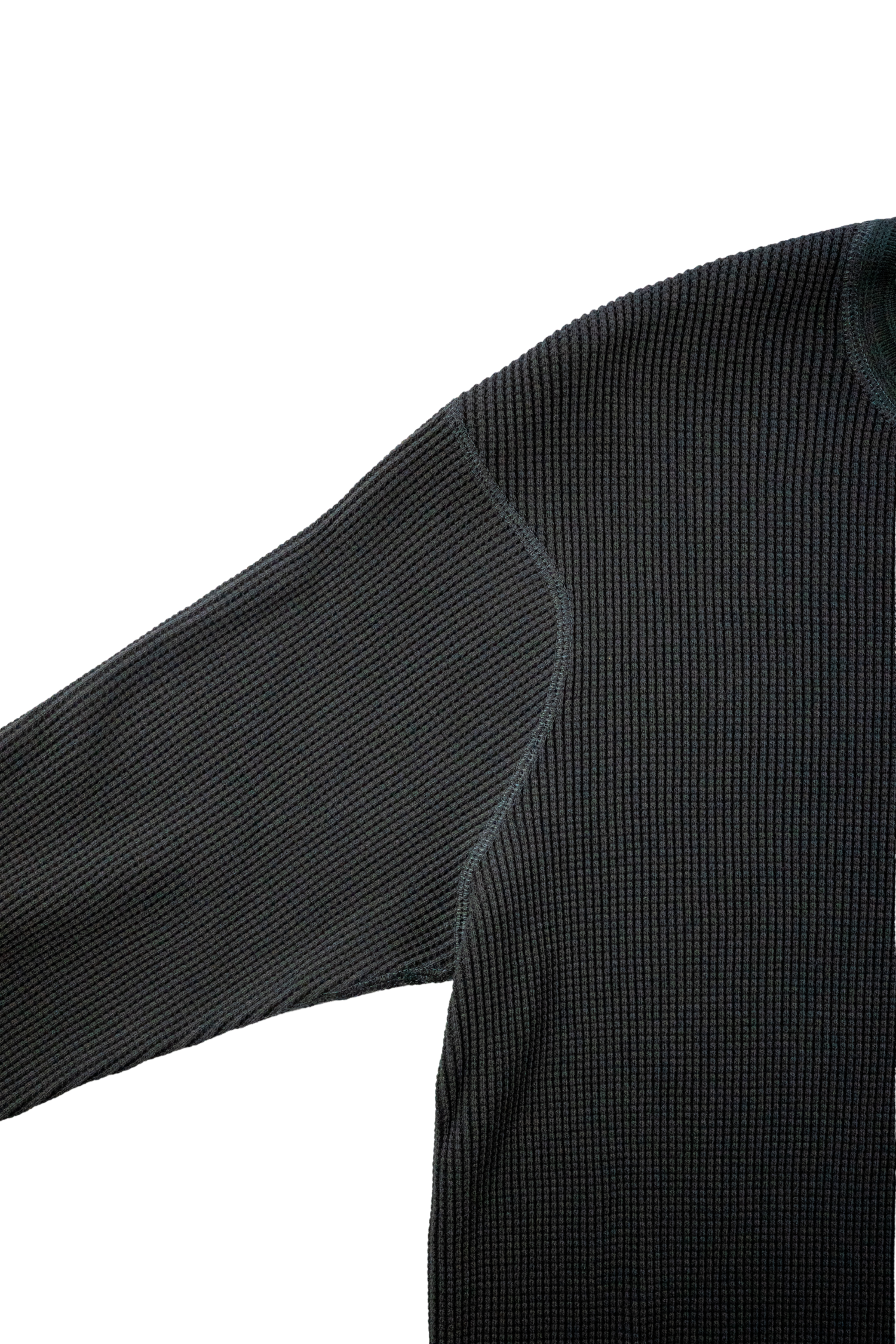 上記3つの項目を実現させるために、機械の設定をアレンジし、生地幅を極限まで狭くして高密度に。ハイゲージの設定でゆっくりと編み上げたオリジナルのワッフル素材になります。