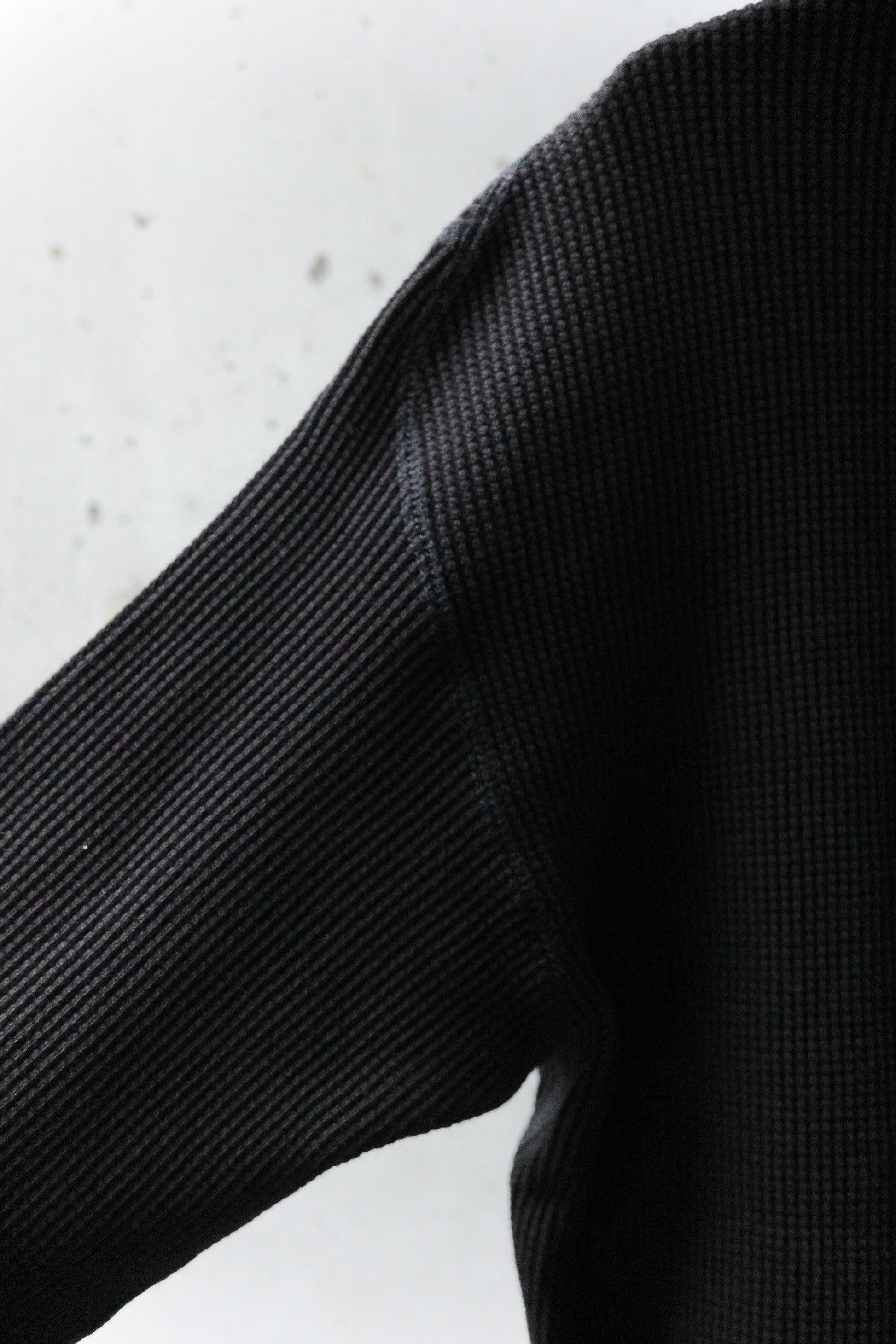 上記3つの項目を実現させるために、機械の設定をアレンジし、生地幅を極限まで狭くして高密度に。ハイゲージの設定でゆっくりと編み上げたオリジナルのワッフル素材になります。