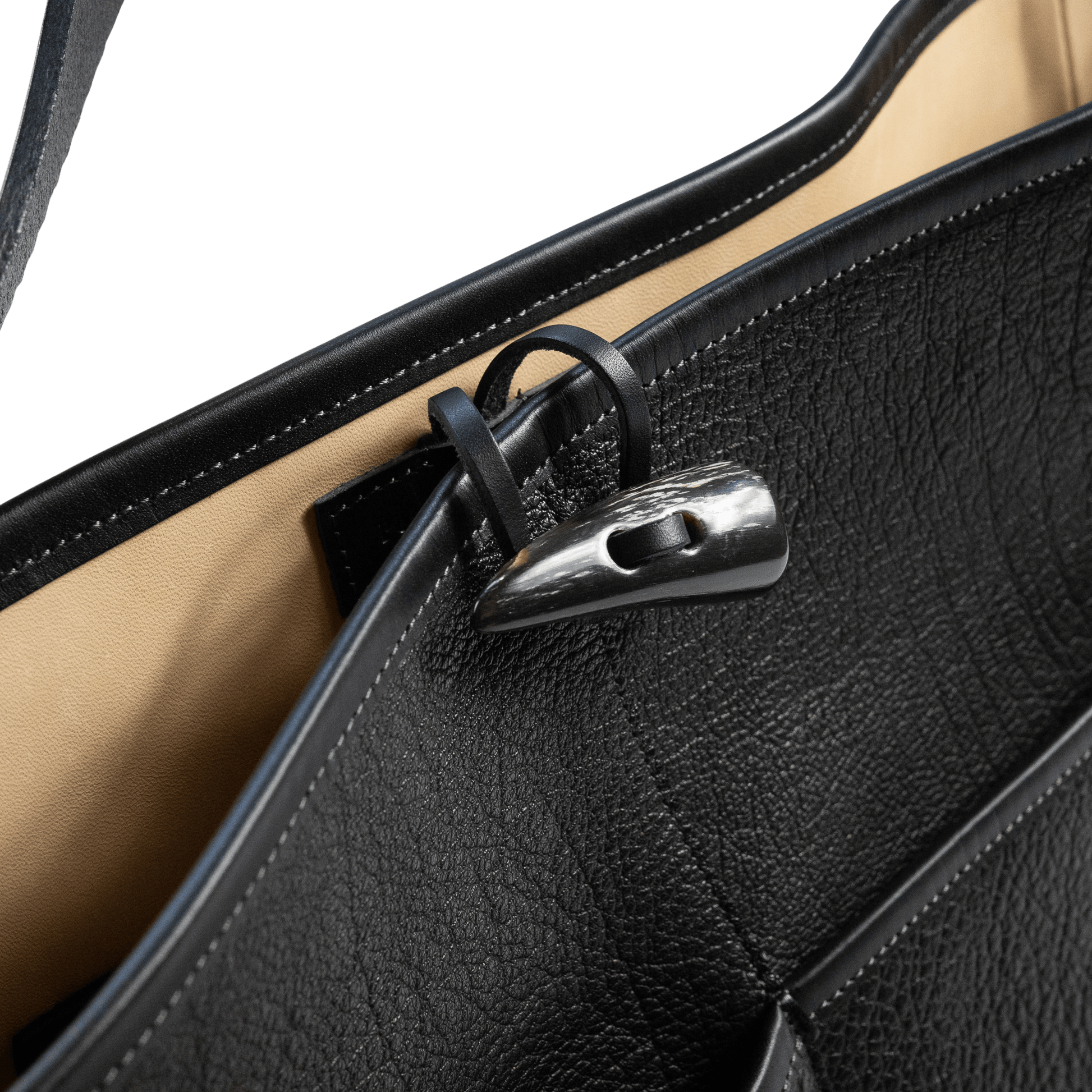 留め具にはボディのレザーと同じく、バッファローから削り出したホーンを使用。