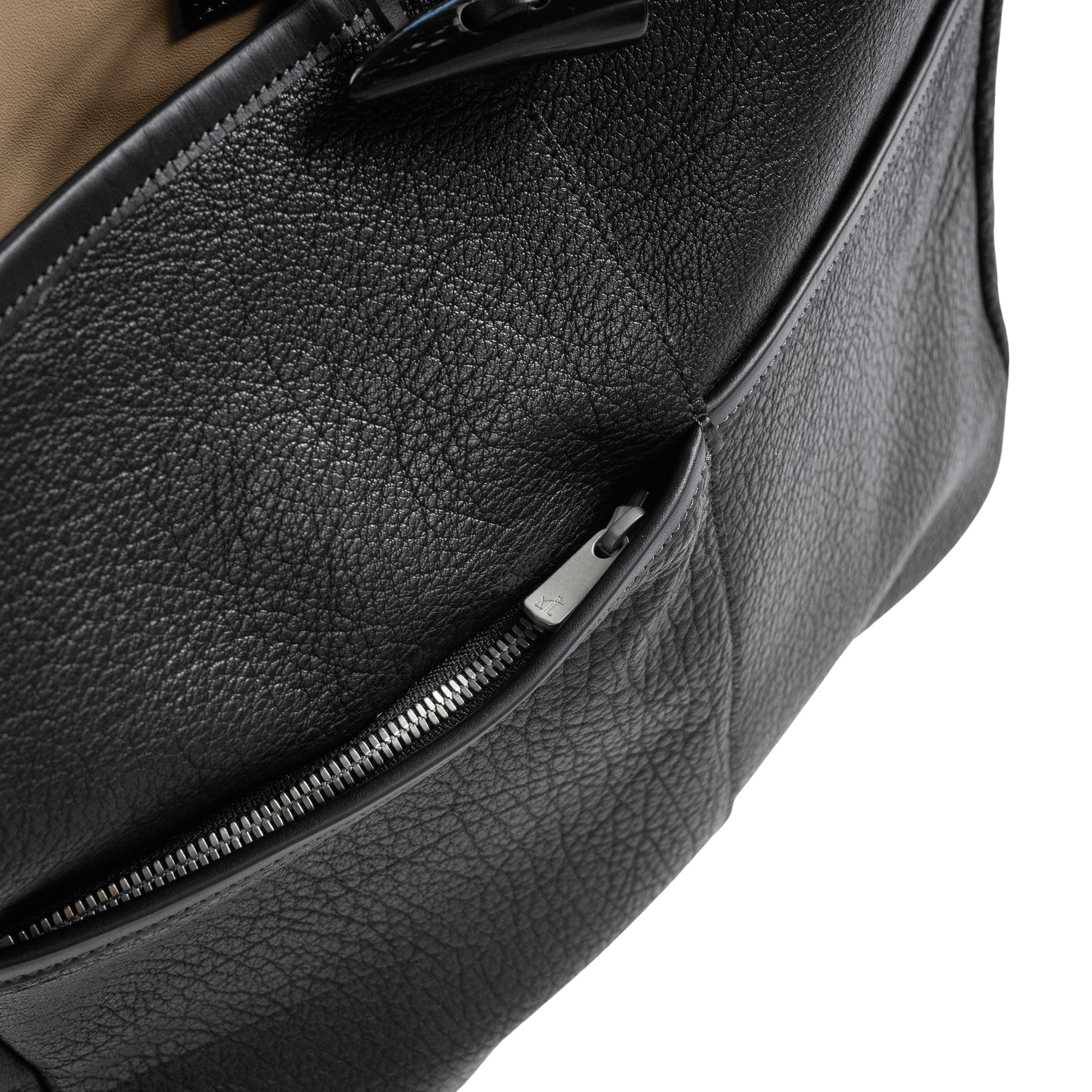 レザーループに引っかけるというシンプルな構造でありながら、視覚的な強さを備え、全体のデザインを引き締めています。