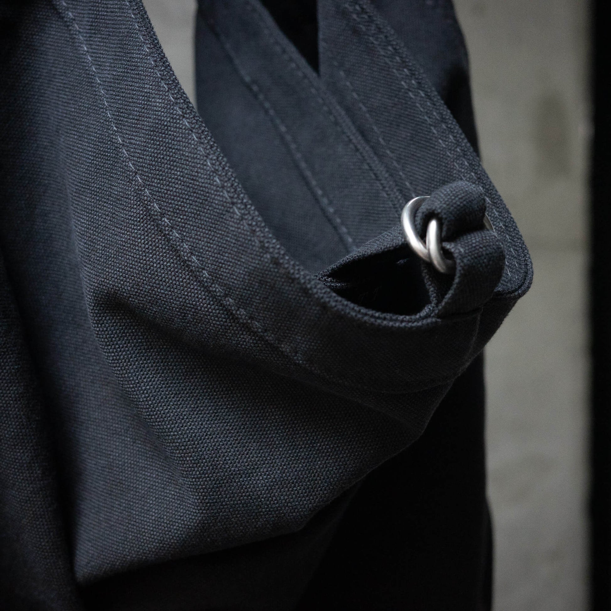 開口部はリングベルトで固定。ウオッシュ加工を施したキャンバス地と、鉄製のパーツのよって構成されています。